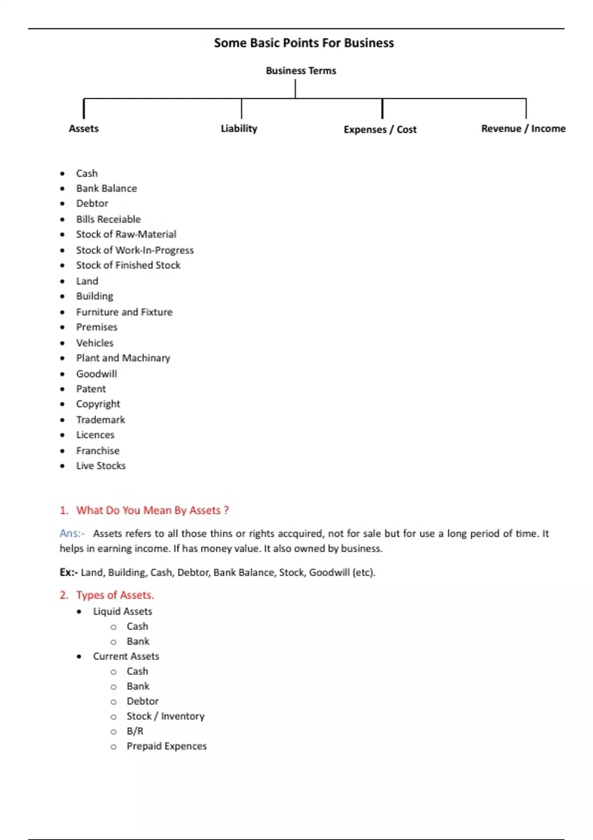 Ans:- Assets refers to all those thins or rights accquired, not for sale but for use a long period of me. It