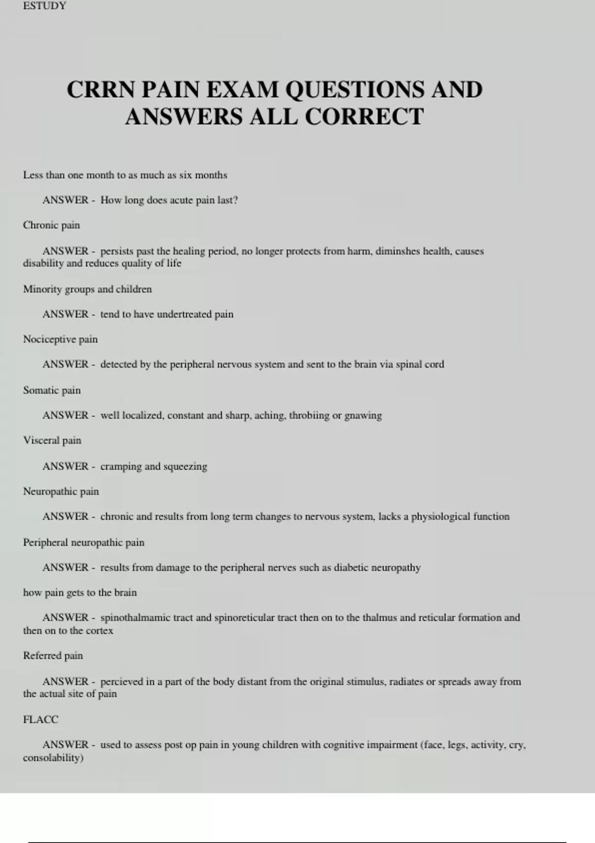 CRRN PAIN EXAM QUESTIONS AND ANSWERS ALL CORRECT
