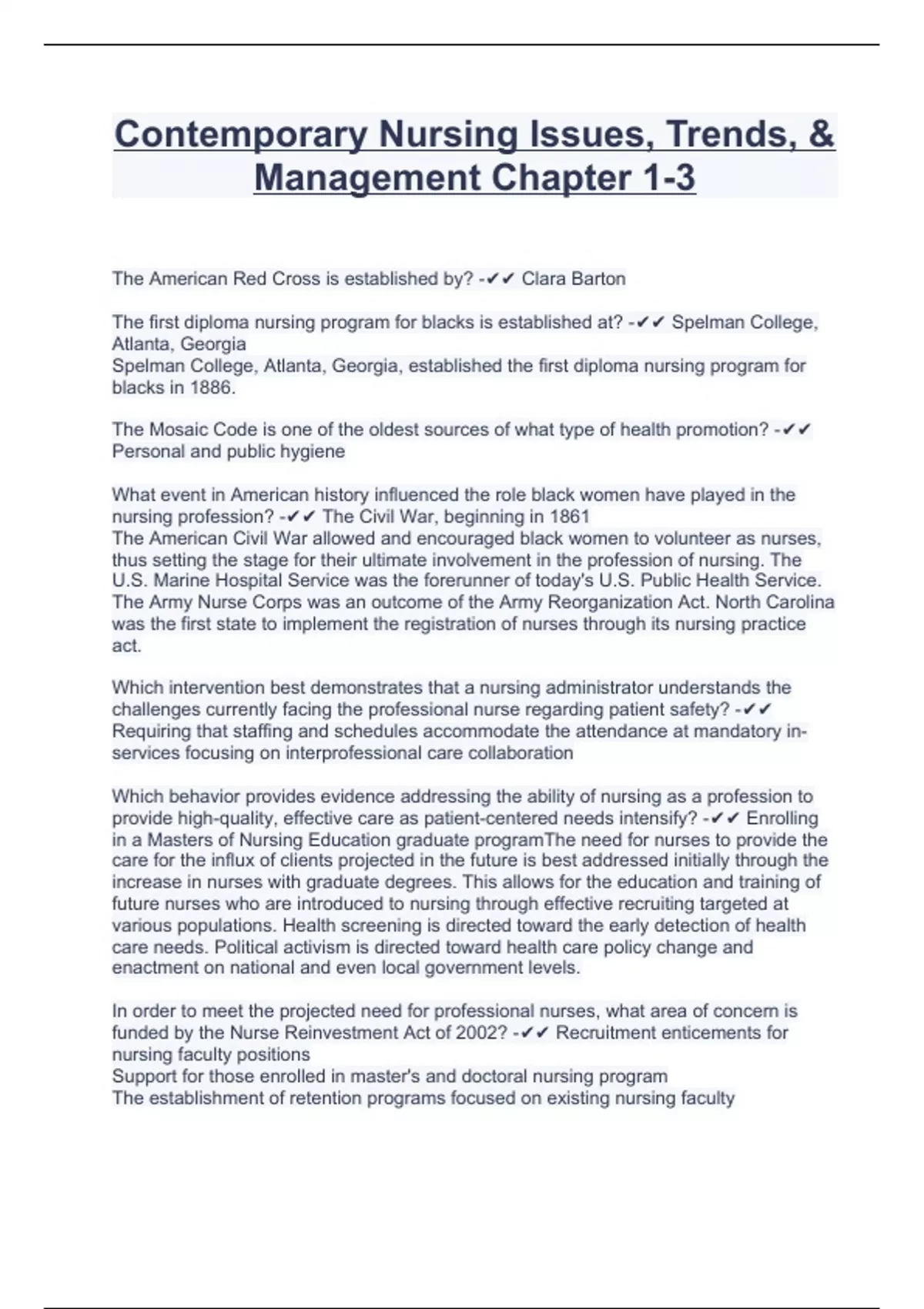 Contemporary Nursing Issues, Trends, & Management Chapter 1-3 The American Red Cross is established by? - Clara Barton The first diploma nursing program for blacks is established at? - Spelman College, Atlanta, Georgia Spelman College, Atlanta, Georgia, established the first diploma nursing program for blacks in 1886. The Mosaic Code is one of the oldest sources of what type of health promotion? - Personal and public hygiene What event in American history influenced the role black women have played in the nursing profession? - The Civil War, beginning in 1861 The American Civil War allowed and encouraged black women to volunteer as nurses, thus setting the stage for their ultimate involvement in the profession of nursing. The U.S. Marine Hospital Service was the forerunner of today's U.S. Public Health Service. The Army Nurse Corps was an outcome of the Army Reorganization Act. North Carolina was the first state to implement the registration of nurses through its nursing practice act. Which intervention best demonstrates that a nursing administrator understands the challenges currently facing the professional nurse regarding patient safety? - Requiring that staffing and schedules accommodate the attendance at mandatory in-services focusing on interprofessional care collaboration Which behavior provides evidence addressing the ability of nursing as a profession to provide high-quality, effective care as patient-centered needs intensify? - Enrolling in a Masters of Nursing Education graduate programThe need for nurses to provide the care for the influx of clients projected in the future is best addressed initially through the increase in nurses with graduate degrees. This allows for the education and training of future nurses who are introduced to nursing through effective recruiting targeted at various populations. Health screening is directed toward the early detection of health care needs. Political activism is directed toward health care policy change and enactment on national and even local government levels. In order to meet the projected need for professional nurses, what area of concern is funded by the Nurse Reinvestment Act of 2002? - Recruitment enticements for nursing faculty positions Support for those enrolled in master's and doctoral nursing program The establishment of retention programs focused on existing nursing faculty What factor is cited as contributing to the inability of America's schools of nursing to meet the expected demand for professional nurses? - Inability to fill faculty positions Insufficient clinical practice sites Lack of clinical preceptors
