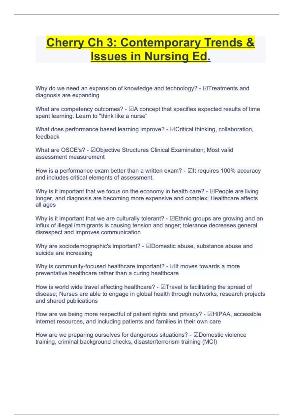 Cherry Ch 3: Contemporary Trends & Issues in Nursing Ed. Why do we need an expansion of knowledge and technology? - ☑Treatments and diagnosis are expanding What are competency outcomes? - ☑A concept that specifies expected results of time spent learning. Learn to "think like a nurse" What does performance based learning improve? - ☑Critical thinking, collaboration, feedback What are OSCE's? - ☑Objective Structures Clinical Examination; Most valid assessment measurement How is a performance exam better than a written exam? - ☑It requires 100% accuracy and includes critical elements of assessment. Why is it important that we focus on the economy in health care? - ☑People are living longer, and diagnosis are becoming more expensive and complex; Healthcare affects all ages Why is it important that we are culturally tolerant? - ☑Ethnic groups are growing and an influx of illegal immigrants is causing tension and anger; tolerance decreases general disrespect and improves communication Why are sociodemographic's important? - ☑Domestic abuse, substance abuse and suicide are increasing