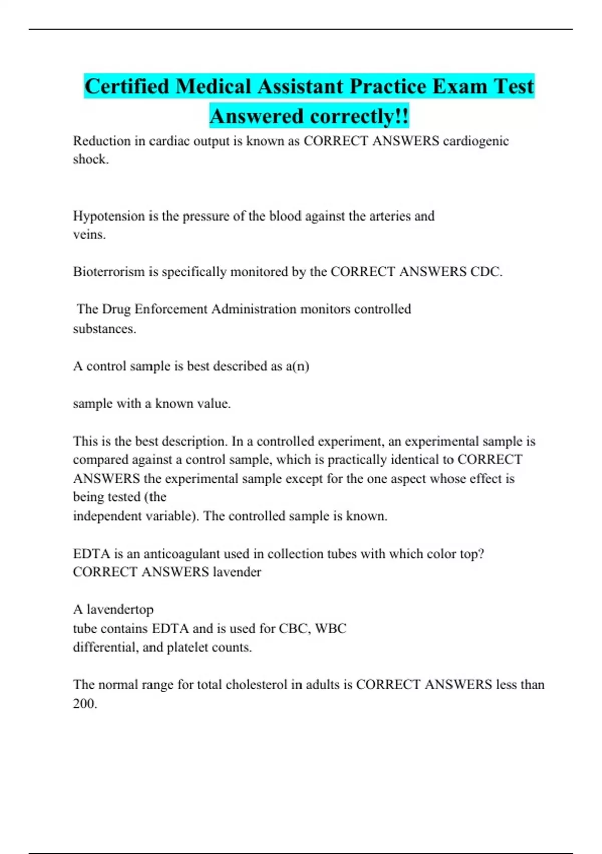Certified Medical Assistant Practice Exam Test Answered correctly!!