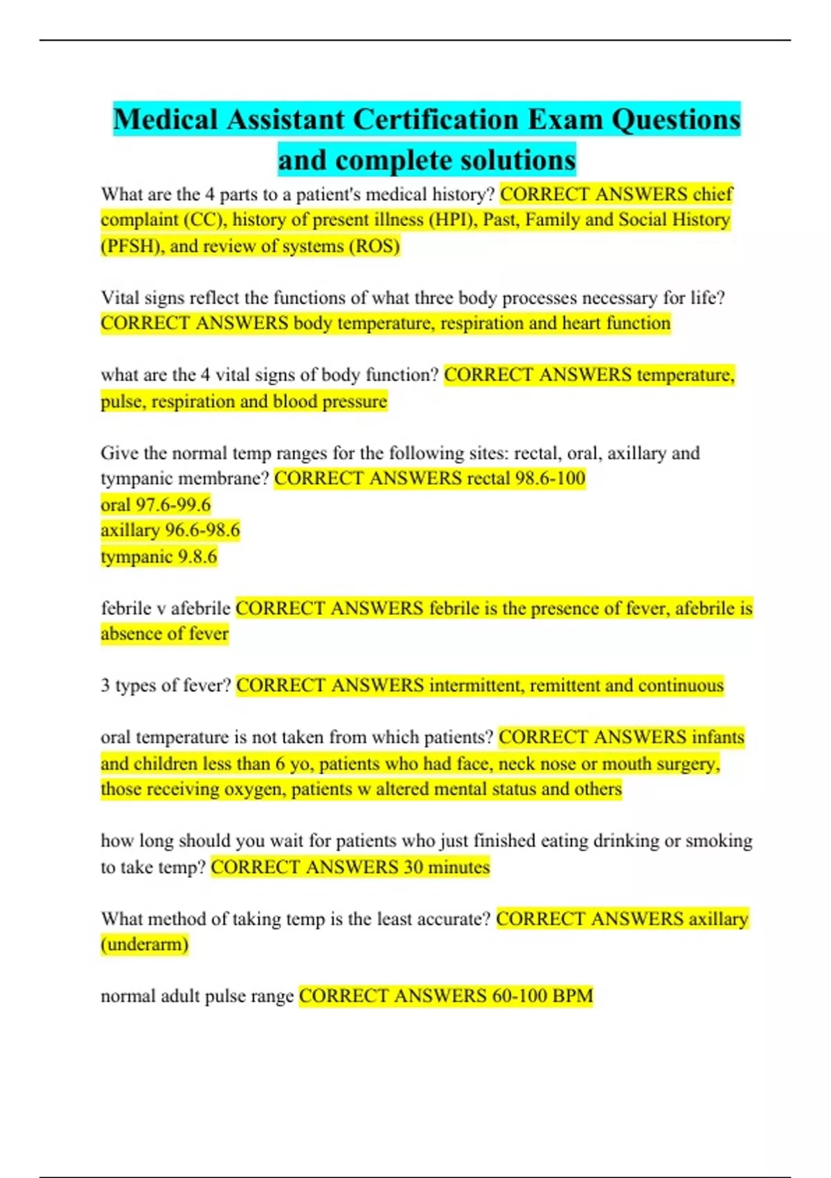 Medical Assistant Certification Exam Questions and complete solutions What are the 4 parts to a patient's medical history? Vital signs reflect the functions of what three body processes necessary for life? what are the 4 vital signs of body function? Give the normal temp ranges for the following sites: rectal, oral, axillary and tympanic membrane? febrile v afebrile 3 types of fever? oral temperature is not taken from which patients? how long should you wait for patients who just finished eating drinking or smoking to take temp? What method of taking temp is the least accurate? normal adult pulse range what is the site most commonly used for taking pulse? normal range for adults respiration? what are 3 respiration rate abnormalities? What are to abnormalities in respiratory rhythm? what does depth of respiration refer to? what are three abnormalities in depth of respirations? Define blood pressure BP consists of what 2 components? Name some common errors in blood pressure measurmens anthropometric refers to what? What are the 4 principles of physical examination?
