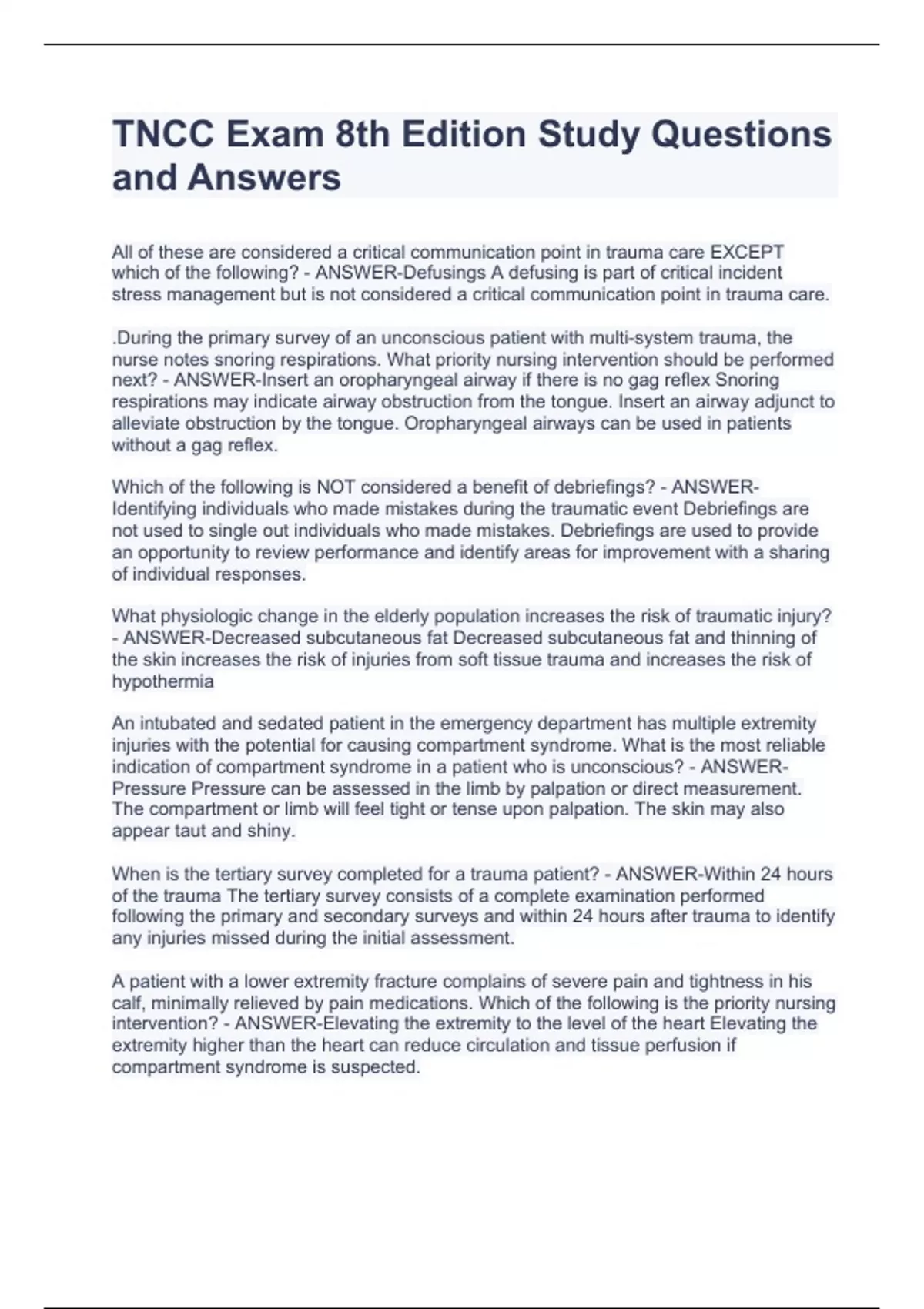 TNCC Exam 8th Edition Study Questions and AnswersTNCC Exam 8th Edition StvTNCC Exam 8th Edition Study Questions and AnswersTNCC Exam 8th Edition Study Questions and AnswersTNCC Exam 8th Edition Study Questions and Answersudy Questions and Answers All of these are considered a critical communication point in trauma care EXCEPT which of the following? - ANSWER-Defusings A defusing is part of critical incident stress management but is not considered a critical communication point in trauma care. .During the primary survey of an unconscious patient with multi-system trauma, the nurse notes snoring respirations. What priority nursing intervention should be performed next? - ANSWER-Insert an oropharyngeal airway if there is no gag reflex Snoring respirations may indicate airway obstruction from the tongue. Insert an airway adjunct to alleviate obstruction by the tongue. Oropharyngeal airways can be used in patients without a gag reflex. Which of the following is NOT considered a benefit of debriefings? - ANSWER-Identifying individuals who made mistakes during the traumatic event Debriefings are not used to single out individuals who made mistakes. Debriefings are used to provide an opportunity to review performance and identify areas for improvement with a sharing of individual responses. What physiologic change in the elderly population increases the risk of traumatic injury? - ANSWER-Decreased subcutaneous fat Decreased subcutaneous fat and thinning of the skin increases the risk of injuries from soft tissue trauma and increases the risk of hypothermia An intubated and sedated patient in the emergency department has multiple extremity injuries with the potential for causing compartment syndrome. What is the most reliable indication of compartment syndrome in a patient who is unconscious? - ANSWER-Pressure Pressure can be assessed in the limb by palpation or direct measurement. The compartment or limb will feel tight or tense upon palpation. The skin may also