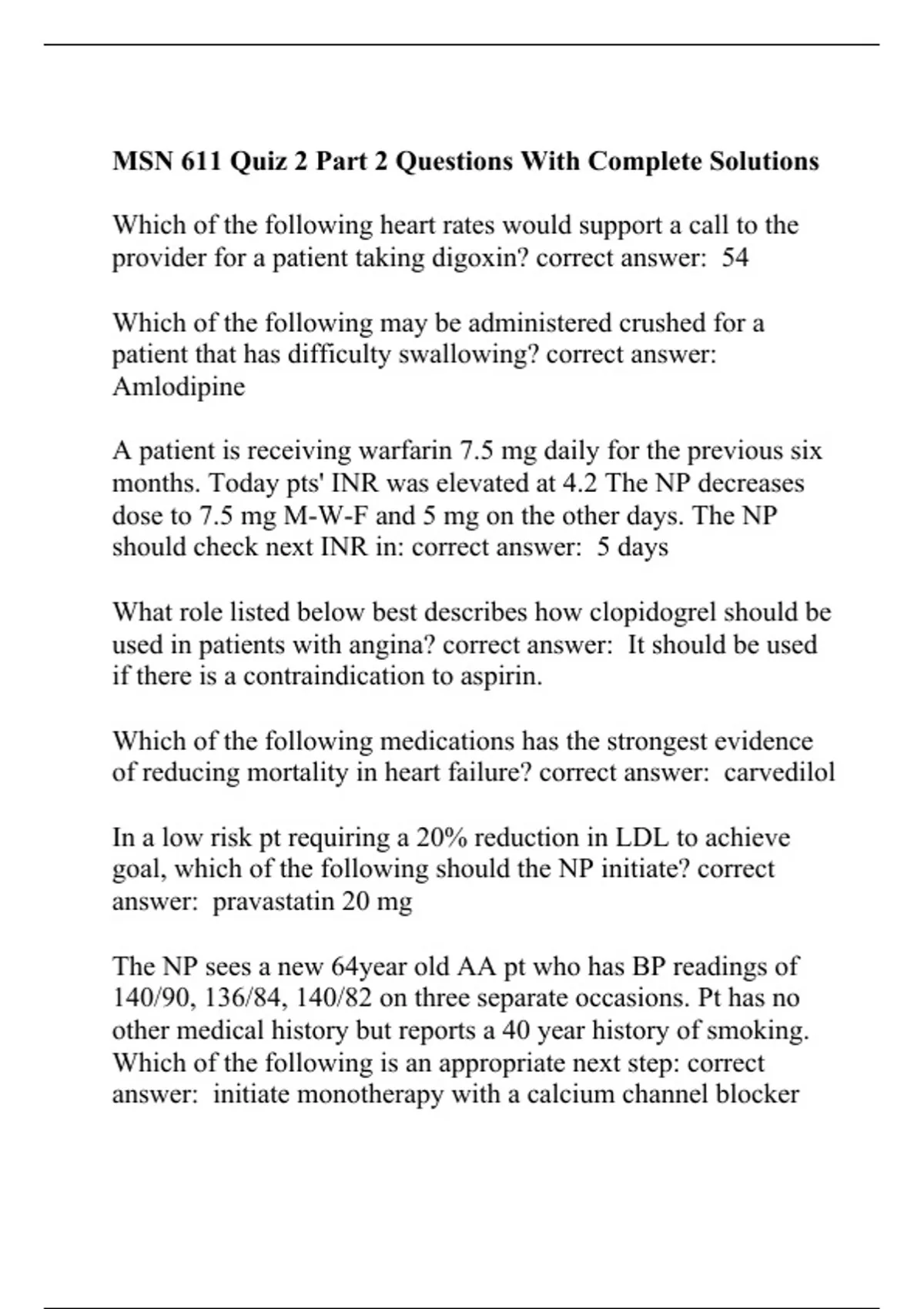 Which of the following heart rates would support a call to the provider for a patient taking digoxin? correct answer: 54 Which of the following may be administered crushed for a patient that has difficulty swallowing? correct answer: Amlodipine A patient is receiving warfarin 7.5 mg daily for the previous six months. Today pts' INR was elevated at 4.2 The NP decreases dose to 7.5 mg M-W-F and 5 mg on the other days. The NP should check next INR in: correct answer: 5 days What role listed below best describes how clopidogrel should be used in patients with angina? correct answer: It should be used if there is a contraindication to aspirin. Which of the following medications has the strongest evidence of reducing mortality in heart failure? correct answer: carvedilol In a low risk pt requiring a 20% reduction in LDL to achieve goal, which of the following should the NP initiate? correct answer: pravastatin 20 mg The NP sees a new 64year old AA pt who has BP readings of 140/90, 136/84, 140/82 on three separate occasions. Pt has no other medical history but reports a 40 year history of smoking. Which of the following is an appropriate next step: correct answer: initiate monotherapy with a calcium ch