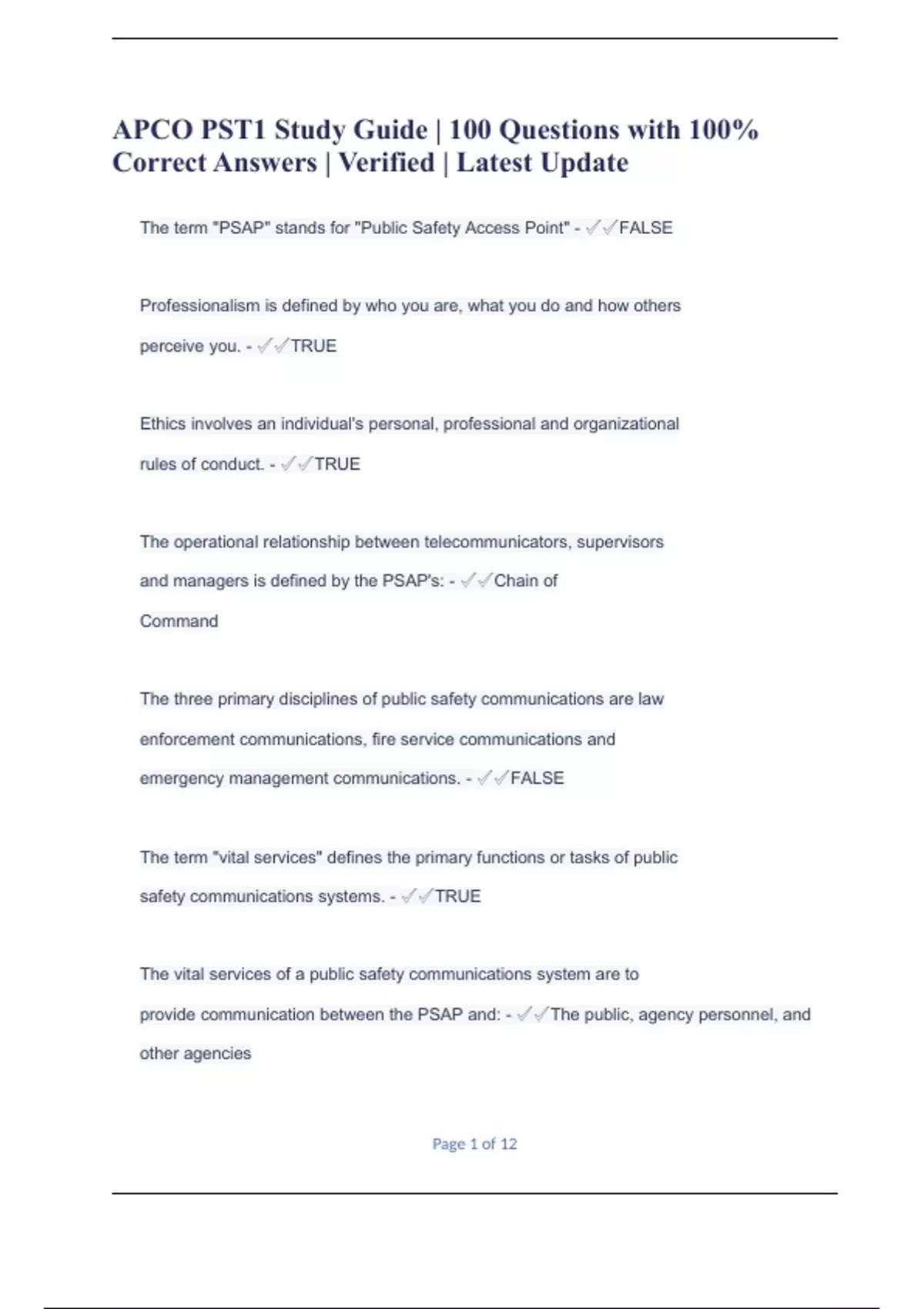 APCO PST1 Study Guide | 100 Questions with 100% Correct Answers | Verified | Latest Update