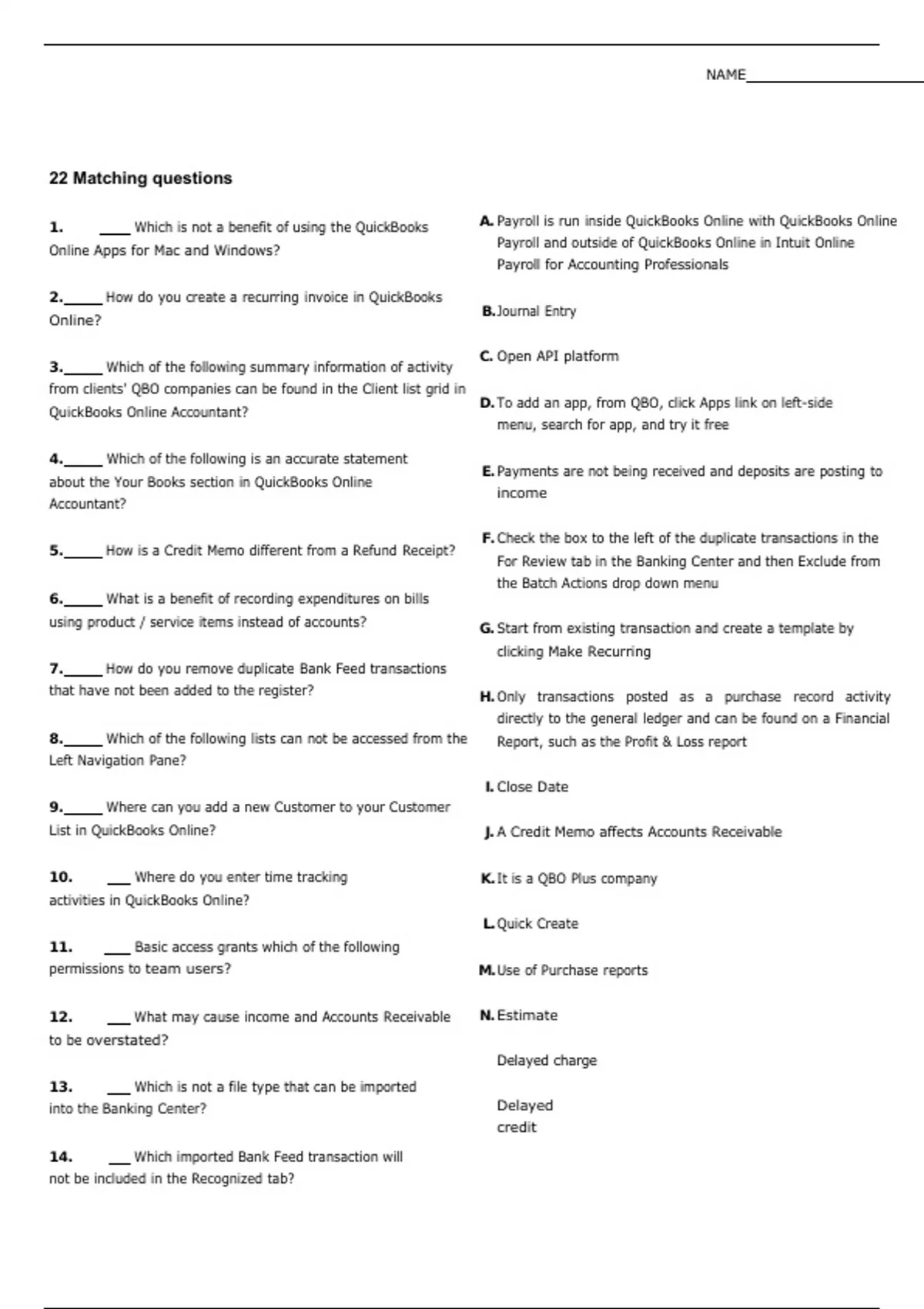 1. Which is not a benefit of using the QuickBooks Online Apps for Mac and Windows? 2. How do you create a recurring invoice in QuickBooks Online? 3. Which of the following summary information of activity from clients' QBO companies can be found in the Client list grid in QuickBooks Online Accountant? 4. Which of the following is an accurate statement about the Your Books section in QuickBooks Online Accountant? 5. How is a Credit Memo different from a Refund Receipt? 6. What is a benefit of recording expenditures on bills using product / service items instead of accounts? 7. How do you remove duplicate Bank Feed transactions that have not been added to the register? 8. Which of the following lists can not be accessed from the Left Navigation Pane? 9. Where can you add a new Customer to your Customer List in QuickBooks Online? 10. Where do you enter time tracking activities in QuickBooks Online? 11. Basic access grants which of the following permissions to team users? 12. What may cause income and Accounts Receivable to be overstated? 13. Which is not a file type that can be imported into the Banking Center? 14. Which imported Bank Feed transaction will not be included in the Recognized tab? NAME A. Payroll is run inside QuickBooks Online with QuickBooks Online Payroll and outside of QuickBooks Online in Intuit Online Payroll for Accounting Professionals B. Journal Entry C. Open API platform D. To add an app, from QBO, click Apps link on left-side menu, search for app, and try it free E. Payments are not being received and deposits are posting to income F. Check the box to the left of the duplicate transactions in the For Review tab in the Banking Center and then Exclude from the Batch Actions drop down menu G. Start from existing transaction and create a template by clicking Make Recurring H. Only transactions posted as a purchase record activity directly to the general ledger and can be found on a Financial Report, such as the Profit & Loss report I. Close Date J. A Credit Memo affects Accounts Receivable K. It is a QBO Plus company L. Quick Create M. Use of Purchase reports N. Estimate Delayed charge Delayed credit 15. The QuickBooks Online allows developers to connect their apps to QuickBooks and send data back and forth between them. 16. Which of the following is an important distinction between QuickBooks Online Payroll and Intuit Online Payroll for Accounting Professionals? 17. Which of the following can be made Recurring in QuickBooks Online? 18. Which of the below is NOT an advantage of recording a transaction as a purchase versus an expense? 19. What are non-posting transactions related to sales? 20. Which of the following would not result in a balance in Opening Balance Equity? 21. Choose the statement that best describes QuickBooks Online's functionality related to sales forms and products and services: 22. Which of the following statements regarding App subscriptions for QuickBooks Online is accurate? 20 Multiple choice questions O. The Customer Center > New Customer P. When adding an income account, the opening balance field was filled in Q. You do not have to be connected to the internet to open your QBO Company R. View-only access to firm information S. .PDF T. Classes U. A transaction that has multiple possible matches in QuickBooks V. Charges to a customer on a sales form post to the account mapped to the product / service item's income account field 1. Employees A. Which of the following cannot be imported using the import data tool in QuickBooks Online? B. Which of the following can be made Recurring in QuickBooks Online? C. Which of the following lists can not be accessed from the Left Navigation Pane? D. Which of the following client user errors might result in the Accounts Payable balance being too high? 2. Be invited as the accountant user from a QuickBooks Online company A. What is one option for creating a new QuickBooks Online Accountant firm? B. Which of the following statements is false about the Opening Balance Equity account? C. Which of the following would not result in a balance in Opening Balance Equity? D. What are non-posting transactions related to sales? 3. All Reports > Business Overview A. Which of the following is not a feature of Online Invoices? B. Where would you find the Audit Log in the Reports Center? C. Which of the following tools is not available in the Accountant Toolbox? D. Which of the following is a feature of QuickBooks Online Payroll? 4. Click on the Accountant ToolBox and choose Report Tools What steps must you complete to handle a bank feed transaction that belongs to a transaction that has been reconciled using the A. Reconcile Tool? If you are using Bank Feeds in QuickBooks Online, what must you do in the Reconcile screen in order to hide transactions you have B. matched or added in a subsequent period? You are getting frustrated because you are always changing the dates when you run reports. What can you do to set default dates C. for reports? D. Choose the statement that best describes QuickBooks Online's functionality related to sales forms and products and services: 5. Apps menu > Find App > Get App Now A. How do you get multiple screens to display over multiple display monitors when working in the QuickBooks Online Apps? B. How does your client integrate a 3rd party app with your QuickBooks Online account? C. What does the Accountant ToolBox allow us to do that our clients cannot do on the Bank Reconciliation screen? D. All of the following types of transactions can be made recurring, except which of the following? 6. 3 A. When you record a charge to a customer on a sales form, what account does the line item charge post to? B. How do you get multiple screens to display over multiple display monitors when working in the QuickBooks Online Apps? C. Which of the following client user errors might result in the Accounts Payable balance being too high? D. How many regular (not accountant Users) can access a QuickBooks Essential s
