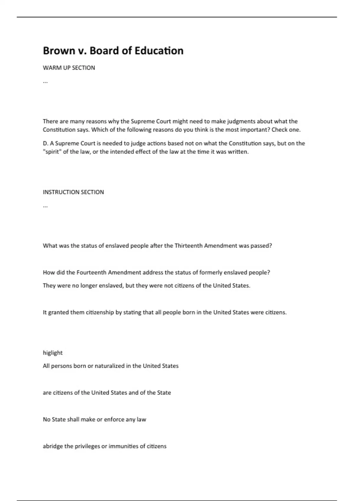 WARM UP SECTION ... There are many reasons why the Supreme Court might need to make judgments about what the Constitution says. Which of the following reasons do you think is the most important? Check one. D. A Supreme Court is needed to judge actions based not on what the Constitution says, but on the "spirit" of the law, or the intended effect of the law at the time it was written. INSTRUCTION SECTION ... What was the status of enslaved people after the Thirteenth Amendment was passed? How did the Fourteenth Amendment address the status of formerly enslaved people? They were no longer enslaved, but they were not citizens of the United States.