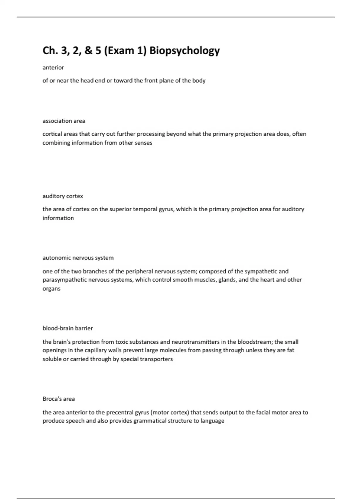 anterior of or near the head end or toward the front plane of the body association area cortical areas that carry out further processing beyond what the primary projection area does, often combining information from other senses auditory cortex the area of cortex on the superior temporal gyrus, which is the primary projection area for auditory information autonomic nervous system one of the two branches of the peripheral nervous system; composed of the sympathetic and parasympathetic nervous systems, which control smooth muscles, glands, and the heart and other organs