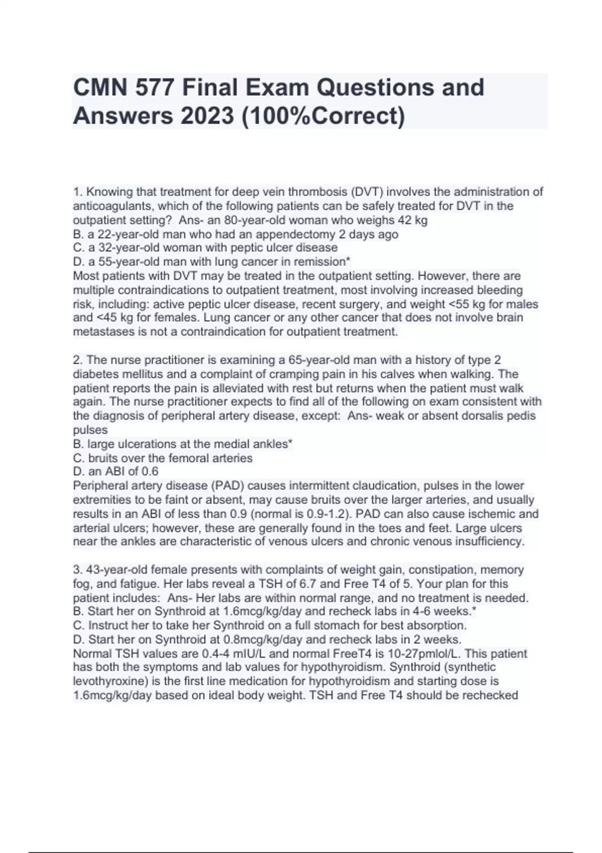 CMN 577 Final Exam Questions and Answers 2023 (100%Correct). 1. Knowing that treatment for deep vein thrombosis (DVT) involves the administration of anticoagulants, which of the following patients can be safely treated for DVT in the outpatient setting? Ans- an 80-year-old woman who weighs 42 kg B. a 22-year-old man who had an appendectomy 2 days ago C. a 32-year-old woman with peptic ulcer disease D. a 55-year-old man with lung cancer in remission* Most patients with DVT may be treated in the outpatient setting. However, there are multiple contraindications to outpatient treatment, most involving increased bleeding risk, including: active peptic ulcer disease, recent surgery, and weight 55 kg for males and 45 kg for females. Lung cancer or any other cancer that does not involve brain metastases is not a contraindication for outpatient treatment. 2. The nurse practitioner is examining a 65-year-old man with a history of type 2 diabetes mellitus and a complaint of cramping pain in his calves when walking. The patient reports the pain is alleviated with rest but returns when the patient must walk again. The nurse practitioner expects to find all of the following on exam consistent with the diagnosis of peripheral artery disease, except: Ans- weak or absent dorsalis pedis pulses B. large ulcerations at the medial ankles* C. bruits over the femoral arteries D. an ABI of 0.6 Peripheral artery disease (PAD) causes intermittent claudication, pulses in the lower extremities to be faint or absent, may cause bruits over the larger arteries, and usually results in an ABI of less than 0.9 (normal is 0.9-1.2). PAD can also cause ischemic and arterial ulcers; however, these are generally found in the toes and feet. Large ulcers near the ankles are characteristic of venous ulcers and chronic venous insufficiency. 3. 43-year-old female presents with complaints of weight gain, constipation, memory fog, and fatigue. Her labs reveal a TSH of 6.7 and Free T4 of 5. Your plan for this patient includes: Ans- Her labs are within normal range, and no treatment is needed. B. Start her on Synthroid at 1.6mcg/kg/day and recheck labs in 4-6 weeks.* C. Instruct her to take her Synthroid on a full stomach for best absorption. D. Start her on Synthroid at 0.8mcg/kg/day and recheck labs in 2 weeks. Normal TSH values are 0.4-4 mIU/L and normal FreeT4 is 10-27pmlol/L. This patient has both the symptoms and lab values for hypothyroidism. Synthroid (synthetic levothyroxine) is the first line medication for hypothyroidism and starting dose is 1.6mcg/kg/day based on ideal body weight. TSH and Free T4 should be rechecked every 4-6 weeks until euthyroid and normal lab values should be obtained within 1-2 months of starting therapy. 4. Cigarette smoking may falsely increase the levels of: Ans- gamma-glutamyl transpeptidase B. sodium and potassium concentrations C. hepatic enzymes* D. serum protein electrophoresis Cigarette smoking may increase hepatic enzymes which in turn will reduce the levels of substances metabolized by the liver such as theophylline. 5. A 75-year-old female patient who is healthy and active reports that she has recently been having trouble getting to the bathroom on time to urinate and also has some leaks when she sneezes or coughs. She reports having to wear an incontinence pad daily. She is very independent and is embarrassed and worried that this is going to affect her lifestyle. As her provider, your best next steps for this patient would be: Ans- Refer her to urology, her symptoms will only get worse and she will more than likely need surgery B. Suggest bladder training and pelvic floor muscle exercises (Kegel's) to decrease incidences of stress and urge incontinence * C. Prescribe an antimuscarinic agent such as oxybutynin immediately D. Schedule the patient for insertion of a pessary For women with mixed stress/urge incontinence, pelvic floor muscle exercises can be effective for decreasing this problem. The other choices are more invasive and would not be first-line conservative treatments. 6. A 40-year-old female waitress presents to the clinic complaining of pain, burning, and tingling in her hands and fingers. She reports the symptoms are most bothersome at night. The NP has carpal tunnel syndrome as a differential diagnosis. All of the following are used to rule in or out this diagnosis EXCEPT: Ans- Tinel test B. Phalen test C. Spurling test * D. Carpal compression test Rationale: A Tinel or Phalen sign may be positive. A Tinel sign is tingling or shock-like pain on volar wrist percussion. The Phalen sign is pain or paresthesia in the distribution of the median nerve when the patient flexes both wrists to 90 degrees for 60 seconds. The carpal compression test, in which numbness and tingling are induced by the direct application of pressure over the carpal tunnel, may be more sensitive and specific than the Tinel and Phalen tests. 7. A 66-year-old Hispanic female presents with a two-year history of detrusor overactivity or "urge incontinence. She has been treated by a physical therapist with bladder training therapy for one year, buts fail to provide appropriate relief. The next possible treatment would be: Ans- Tolterodine 1-2 mg orally 2x daily B. Oxybutynin 2.5 - 5mg orally 2-3x daily C. Refer to OB/Gyn for a pessary fitting D. All of the above* Antimuscarinic agents such as tolterodine or oxybutynin may provide additional benefit in stress incontinence issues. These medications must be used with caution due to the side effects of dry mouth, urine retention, and delirium. A pessary may also be of additional benefit but should be prescribed only by providers who are experienced in the selection, placement, and management of these devices. 8. A 23-year-old male patient presents to the clinic with complaints of fever, irritative voiding symptoms, and perineal/suprapubic pain for 2 days. On exam, the CBC shows leukocytosis and a left shift. UA is positive for pyuria and bacteriuria. There is no CV