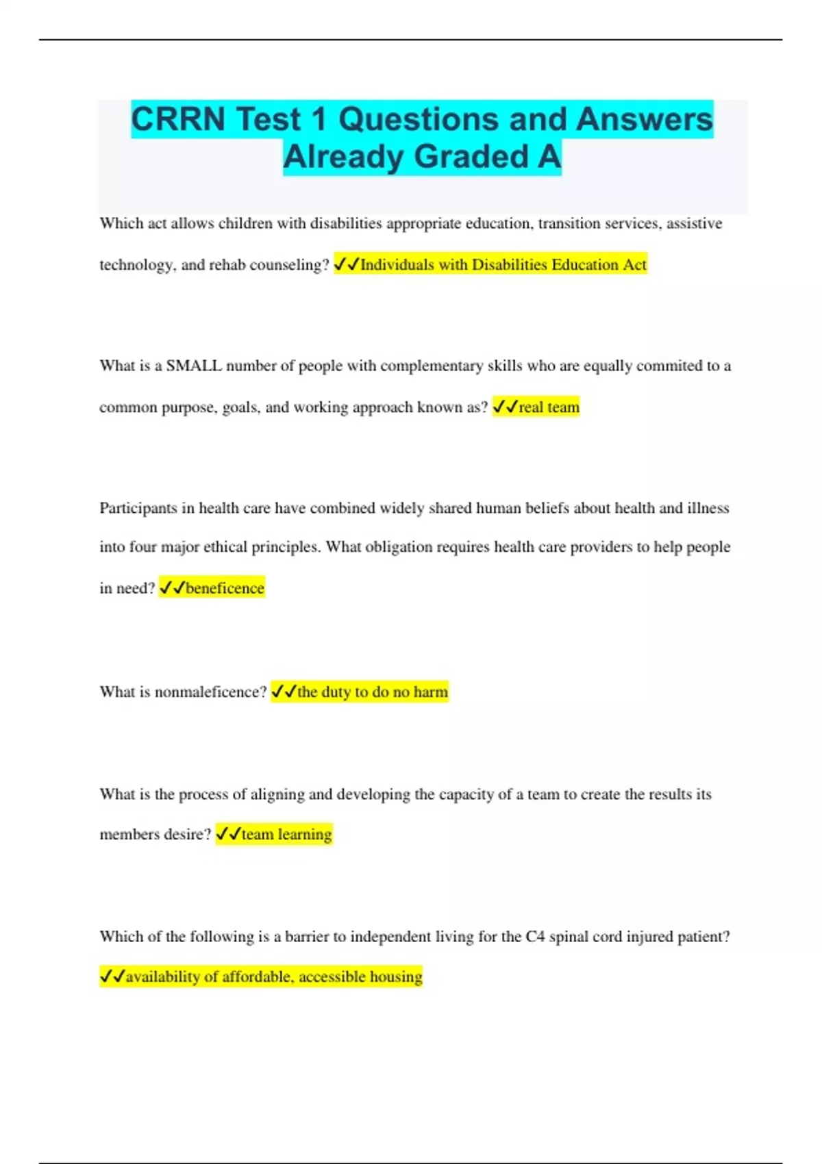 CRRN Test 1 Questions and Answers Already Graded A Which act allows children with disabilities appropriate education, transition services, assistive technology, and rehab counseling? Individuals with Disabilities Education Act What is a SMALL number of people with complementary skills who are equally commited to a common purpose, goals, and working approach known as? real team Participants in health care have combined widely shared human beliefs about health and illness into four major ethical principles. What obligation requires health care providers to help people in need? beneficence What is nonmaleficence? the duty to do no harm What is the process of aligning and developing the capacity of a team to create the results its members desire? team learning Which of the following is a barrier to independent living for the C4 spinal cord injured patient? availability of affordable, accessible housing Which method of paying health care providers shifts part of the financial risk to hospitals by paying a fixed amount based on admission diagnosis? prospective payment Which christian sect maintains Saturday as the holy day? seventh day adventist What would be the BEST approach for the rehab nurse with a new interest in political activism? identify one issue of interest and act on it What is included in the American with Disabilities Act of 1990? mandates 24 hour relay services by telephone companies so that individuals with telecommunication devices for the deaf could communicate with those who do not have those devices Which team model is UNCOMMON in rehab practice? medical Which tool should be used in the nursing assessment of pressure ulcer risk? Braden Scale Rebound occurs when an individual spends insufficient time in certain stages of sleep. For which of the following stages is rebound an IMPORTANT concept? stage 4 Rebound occurs: when an individual is deprived of Stage 4 sleep Which statement is incorporated in Orem's self care theory? investigation/decision making where the pt. has control and input regarding activity Which nursing theorist views the person as a biological, symbolic, and social unit? Dorothea Orem Which spinal cord injury syndrome causes paralysis and loss of position sense on the same side as the injury and loss of pain and temperature sensations on the opposite side? Brown-Sequard syndrome What are the two PRIMARY goals of the interdisciplinary team in pediatric rehabilitation? provision of care and self-maintenance Which level of wellness views rehabilitation activities and the monitoring of health care processes to prevent complications or further illness, injury or disability? tertiary prevention How does an independent living program support an individual with a disability? allows pts. to remain in their own dwellings while offering support services Which techique allows the user to determine the volume of pts. required for a progam to be financially self-sufficient? break-even analysis When comparing one facility's selected outcomes with those of another facility's outstanding outcomes this is considered which process? benchmarking Which strategy, when implemented prior to discharge, promotes communication, defines the roles of each party, clearly outlines expected outcomes, defines the limitations of care, and establishes home health care agency liability? health contract