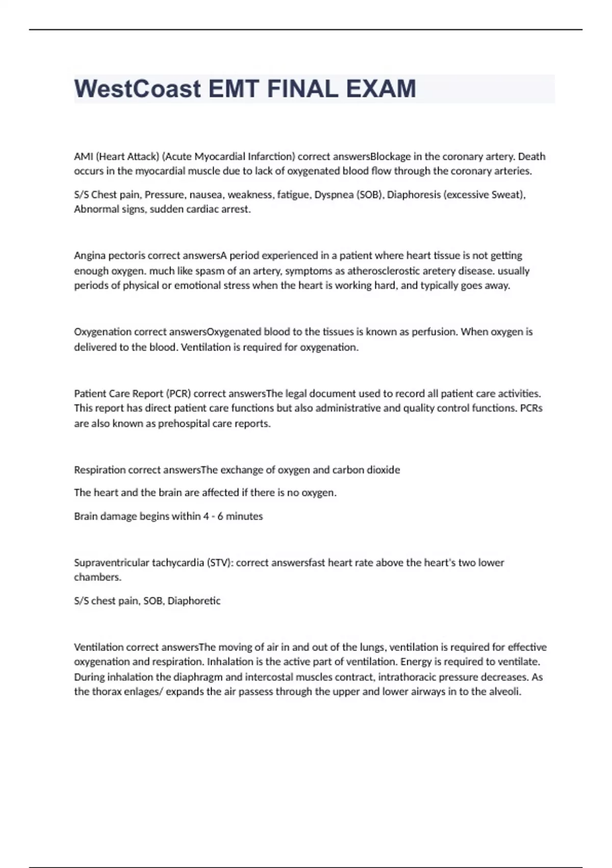 AMI (Heart Attack) (Acute Myocardial Infarction) Blockage in the coronary artery. Death occurs in the myocardial muscle due to lack of oxygenated blood flow through the coronary arteries. S/S Chest pain, Pressure, nausea, weakness, fatigue, Dyspnea (SOB), Diaphoresis (excessive Sweat), Abnormal signs, sudden cardiac arrest. Angina pectoris A period experienced in a patient where heart tissue is not getting enough oxygen. much like spasm of an artery, symptoms as atherosclerostic aretery disease. usually periods of physical or emotional stress when the heart is working hard, and typically goes away. Oxygenation Oxygenated blood to the tissues is known as perfusion. When oxygen is delivered to the blood. Ventilation is required for oxygenation. Patient Care Report (PCR) The legal document used to record all patient care activities. This report has direct patient care functions but also administrative and quality control functions. PCRs are also known as prehospital care reports. Respiration The exchange of oxygen and carbon dioxide The heart and the brain are affected if there is no oxygen. Brain damage begins within 4 - 6 minutes Supraventricular tachycardia (STV): fast heart rate above the heart's two lower chambers. S/S chest pain, SOB, Diaphoretic Ventilation The moving of air in and out of the lungs, ventilation is required for effective oxygenation and respiration. Inhalation is the active part of ventilation. Energy is required to ventilate. During inhalation the diaphragm and intercostal muscles contract, intrathoracic pressure decreases. As the thorax enlages/ expands the air passess through the upper and lower airways in to the alveoli. Perfusion Passage of blood, a blood substitute or other fluid through the blood vessels or other natural channels in an organ or tissue. Aspiration Fluid or tissue or other substances that go into the lungs that can cause pneumonia or other lung problems. Intracerebral pressure (ICP) Accumulations of blood within the skull or swelling of the brain(cause). ICP squeezes the brain against bony prominences within the cranium. cheyne stokes or ataxic. S/S decreased pulse, headache, nausea, vomit, decreased alertness, bradycardia, sluggish or nonreactive pupils, decerebrate posturing, and increased or widened blood pressure. Cushing reflex(increased systolic bp, irregular respirations, and decreased pulse rate)