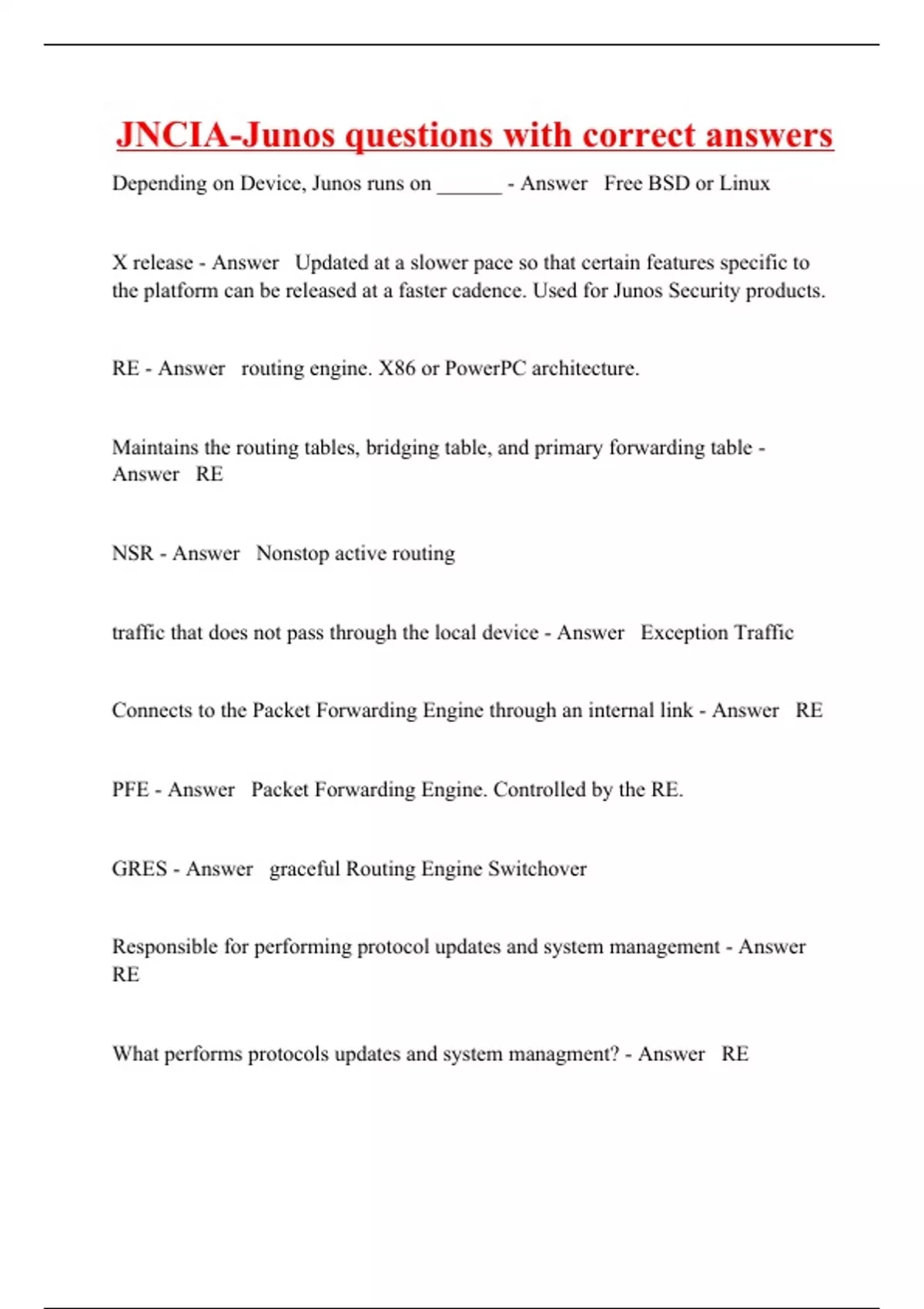 Depending on Device, Junos runs on ______ - Answer Free BSD or Linux X release - Answer Updated at a slower pace so that certain features specific to the platform can be released at a faster cadence. Used for Junos Security products. RE - Answer routing engine. X86 or PowerPC architecture. Maintains the routing tables, bridging table, and primary forwarding table - Answer RE NSR - Answer Nonstop active routing traffic that does not pass through the local device - Answer Exception Traffic Connects to the Packet Forwarding Engine through an internal link - Answer RE PFE - Answer Packet Forwarding Engine. Controlled by the RE. GRES - Answer graceful Routing Engine Switchover Responsible for performing protocol updates and system management - Answer RE What performs protocols updates and system managment? - Answer RE