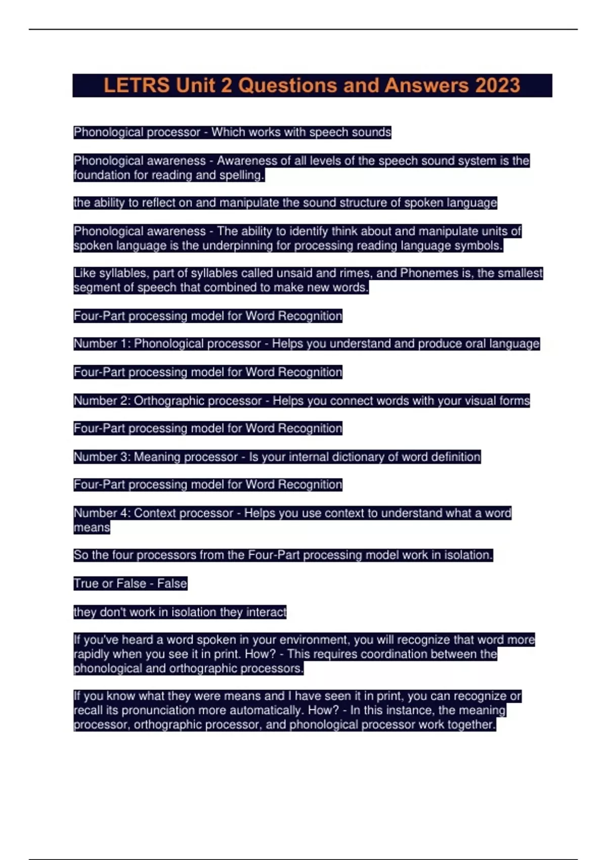 LETRS Unit 2 Questions and Answers 2023