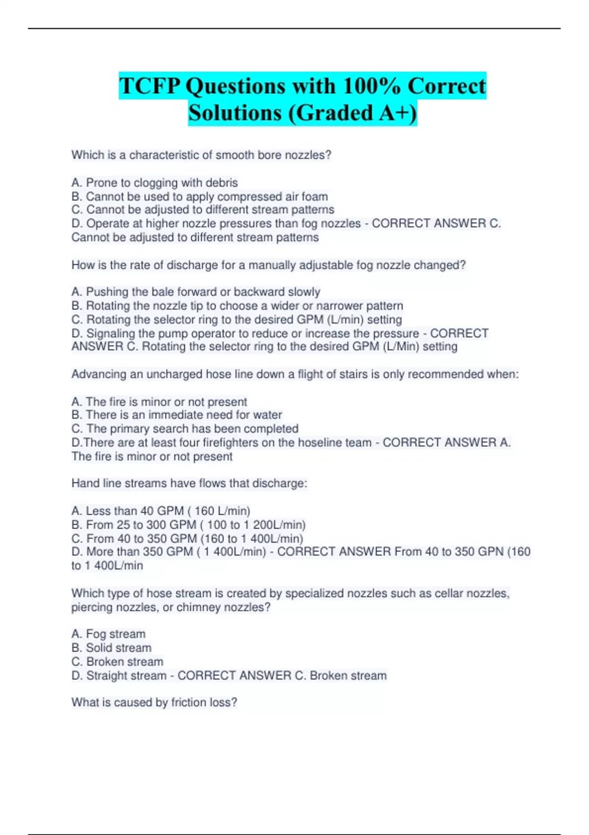TCFP Questions with 100% Correct Solutions (Graded A+) Which is a characteristic of smooth bore nozzles? A. Prone to clogging with debris B. Cannot be used to apply compressed air foam C. Cannot be adjusted to different stream patterns D. Operate at higher nozzle pressures than fog nozzles - CORRECT ANSWER C. Cannot be adjusted to different stream patterns How is the rate of discharge for a manually adjustable fog nozzle changed? A. Pushing the bale forward or backward slowly B. Rotating the nozzle tip to choose a wider or narrower pattern C. Rotating the selector ring to the desired GPM (L/min) setting D. Signaling the pump operator to reduce or increase the pressure - CORRECT ANSWER C. Rotating the selector ring to the desired GPM (L/Min) setting Advancing an uncharged hose line down a flight of stairs is only recommended when: A. The fire is minor or not present B. There is an immediate need for water C. The primary search has been completed D.There are at least four firefighters on the hoseline team - CORRECT ANSWER A. The fire is minor or not present Hand line streams have flows that discharge: A. Less than 40 GPM ( 160 L/min) B. From 25 to 300 GPM ( 100 to 1 200L/min) C. From 40 to 350 GPM (160 to 1 400L/min) D. More than 350 GPM ( 1 400L/min) - CORRECT ANSWER From 40 to 350 GPN (160 to 1 400L/min Which type of hose stream is created by specialized nozzles such as cellar nozzles, piercing nozzles, or chimney nozzles? A. Fog stream B. Solid stream C. Broken stream D. Straight stream - CORRECT ANSWER C. Broken stream What is caused by friction loss? A. Increased nozzle reaction B. Decreased nozzle reaction C. Lower water pressure at the pump D. Lower water pressure at the nozzle - CORRECT ANSWER D. Lower water pressure at the nozzle