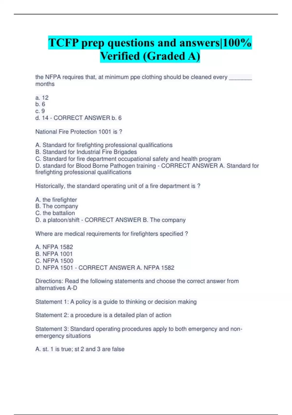 TCFP prep questions and answers|100% Verified (Graded A) the NFPA requires that, at minimum ppe clothing should be cleaned every _______ months a. 12 b. 6 c. 9 d. 14 - CORRECT ANSWER b. 6 National Fire Protection 1001 is ? A. Standard for firefighting professional qualifications B. Standard for Industrial Fire Brigades C. Standard for fire department occupational safety and health program D. standard for Blood Borne Pathogen training - CORRECT ANSWER A. Standard for firefighting professional qualifications Historically, the standard operating unit of a fire department is ? A. the firefighter B. The company C. the battalion D. a platoon/shift - CORRECT ANSWER B. The company Where are medical requirements for firefighters specified ? A. NFPA 1582 B. NFPA 1001 C. NFPA 1500 D. NFPA 1501 - CORRECT ANSWER A. NFPA 1582 Directions: Read the following statements and choose the correct answer from alternatives A-D Statement 1: A policy is a guide to thinking or decision making Statement 2: a procedure is a detailed plan of action Statement 3: Standard operating procedures apply to both emergency and nonemergency situations A. st. 1 is true; st 2 and 3 are false B. st 1 and 2 are false; st 3 is true C. St 1 is false; st 2 and 3 are true D. all statements are true - CORRECT ANSWER D. all statements are true