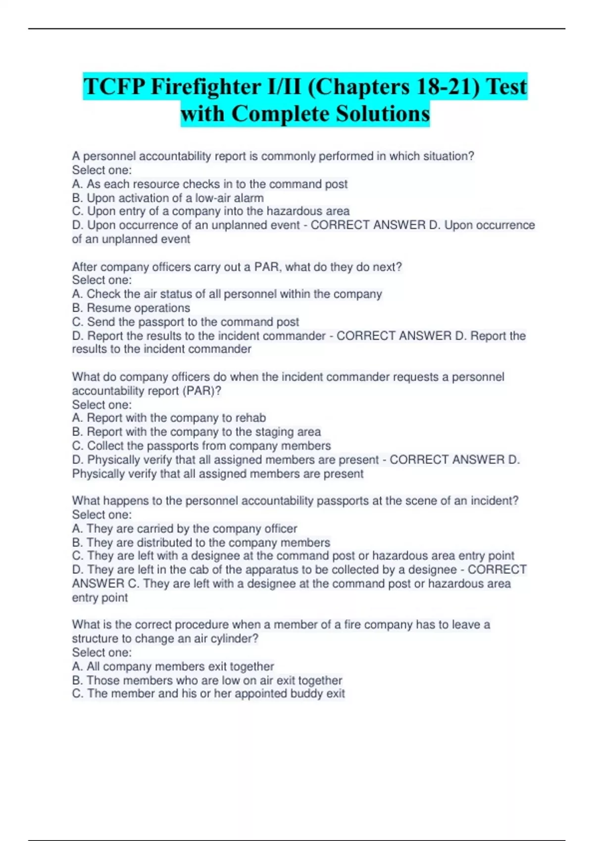 TCFP Firefighter I/II (Chapters 18-21) Test with Complete Solutions A personnel accountability report is commonly performed in which situation? Select one: A. As each resource checks in to the command post B. Upon activation of a low-air alarm C. Upon entry of a company into the hazardous area D. Upon occurrence of an unplanned event - CORRECT ANSWER D. Upon occurrence of an unplanned event After company officers carry out a PAR, what do they do next? Select one: A. Check the air status of all personnel within the company B. Resume operations C. Send the passport to the command post D. Report the results to the incident commander - CORRECT ANSWER D. Report the results to the incident commander What do company officers do when the incident commander requests a personnel accountability report (PAR)? Select one: A. Report with the company to rehab B. Report with the company to the staging area C. Collect the passports from company members D. Physically verify that all assigned members are present - CORRECT ANSWER D. Physically verify that all assigned members are present What happens to the personnel accountability passports at the scene of an incident? Select one: A. They are carried by the company officer B. They are distributed to the company members C. They are left with a designee at the command post or hazardous area entry point D. They are left in the cab of the apparatus to be collected by a designee - CORRECT ANSWER C. They are left with a designee at the command post or hazardous area entry point What is the correct procedure when a member of a fire company has to leave a structure to change an air cylinder? Select one: A. All company members exit together B. Those members who are low on air exit together C. The member and his or her appointed buddy exit D. The member exits alone if he or she can do so safely - CORRECT ANSWER A. All company members exit together What is the function of a personnel accountability system? Select one: A. Prevent freelancing and deviation from SOPs B. Establish and maintain team integrity C. Organize resources into divisions, groups, and crews D. Track the location and assignments of all personnel at the incident - CORRECT ANSWER D. Track the location and assignments of all personnel at the incident