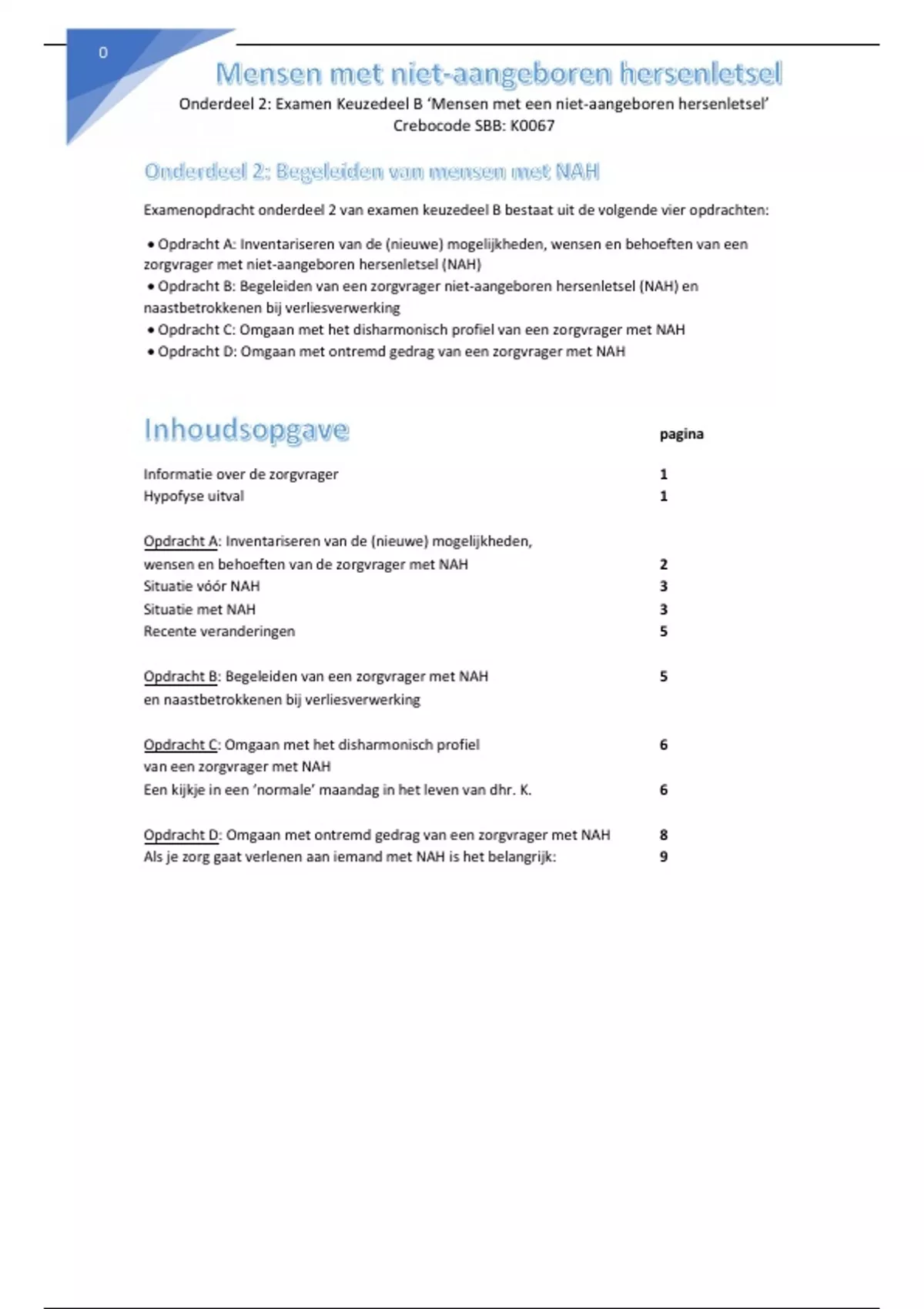 niveau 4 verpleegkundige: Examen keuzedeel Onderdeel 1: 'Mensen met een NAH' Behaald cijfer: 10 Onder andere beschreven: - Beschrijving van anatomie en fysiologie van de hersenen; - ICF-model; - Neurologische en cognitieve stoornissen; - Moeilijk verstaanbaar gedrag (MVG); - Coping; - Gedragscirkel Onderdeel 2: 'Begeleiden van mensen met NAH' is eveneens te koop