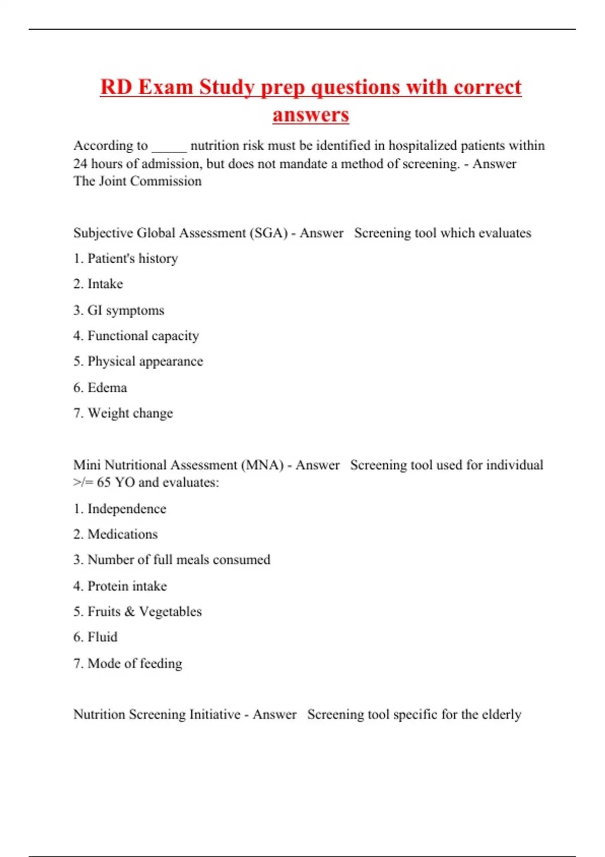 According to _____ nutrition risk must be identified in hospitalized patients within 24 hours of admission, but does not mandate a method of screening. - Answer The Joint Commission Subjective Global Assessment (SGA) - Answer Screening tool which evaluates 1. Patient's history 2. Intake 3. GI symptoms 4. Functional capacity 5. Physical appearance 6. Edema 7. Weight change Mini Nutritional Assessment (MNA) - Answer Screening tool used for individual >/= 65 YO and evaluates: 1. Independence 2. Medications 3. Number of full meals consumed 4. Protein intake 5. Fruits & Vegetables 6. Fluid 7. Mode of feeding Nutrition Screening Initiative - Answer Screening tool speci