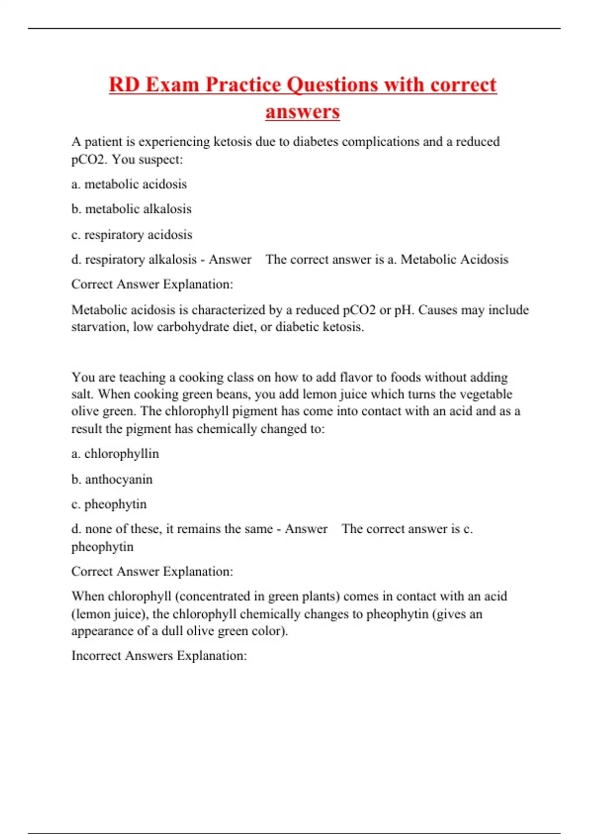 A patient is experiencing ketosis due to diabetes complications and a reduced pCO2. You suspect: a. metabolic acidosis b. metabolic alkalosis c. respiratory acidosis d. respiratory alkalosis - Answer The correct answer is a. Metabolic Acidosis Correct Answer Explanation: Metabolic acidosis is characterized by a reduced pCO2 or pH. Causes may include starvation, low carbohydrate diet, or diabetic ketosis. You are teaching a cooking class on how to add flavor to foods without adding salt. When cooking green beans, you add lemon juice which turns the vegetable olive green. The chlorophyll pigment has come into contact with an acid and as a result the pigment has chemically changed to: a. chlorophyllin b. anthocyanin c. pheophytin d. none of these, it remains the same - Answer The correct answer is c. pheophytin Correct Answer Explanation: When chlorophyll (concentrated in green plants) comes in contact with an acid (lemon juice), the chlorophyll chemically changes to pheophytin (gives an appearance of a dull olive green color). Incorrect Answers Explanation: Chlorophyllin results when an alkali (baking soda) is add