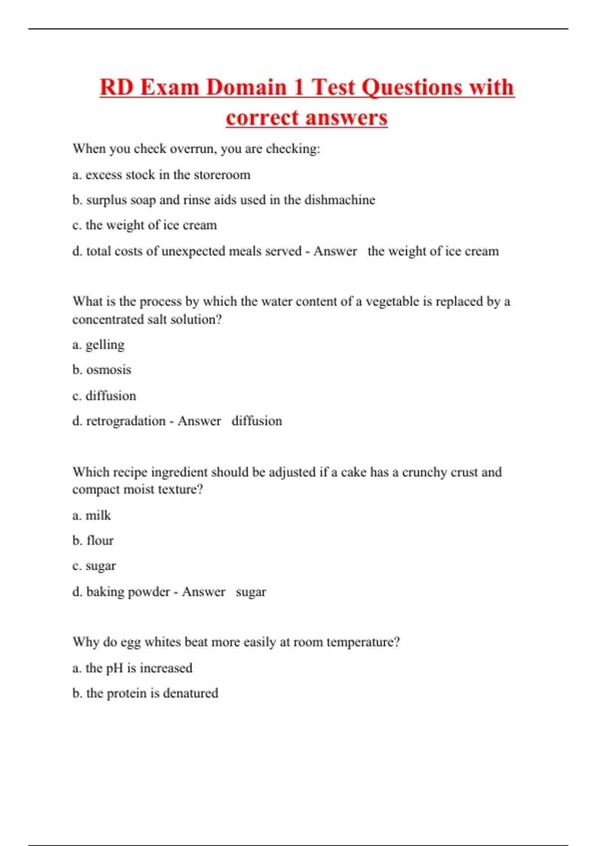 When you check overrun, you are checking: a. excess stock in the storeroom b. surplus soap and rinse aids used in the dishmachine c. the weight of ice cream d. total costs of unexpected meals served - Answer the weight of ice cream What is the process by which the water content of a vegetable is replaced by a concentrated salt solution? a. gelling b. osmosis c. diffusion d. retrogradation - Answer diffusion Which recipe ingredient should be adjusted if a cake has a crunchy crust and compact moist texture? a. milk b. flour c. sugar d. baking powder - Answer sugar Why do egg whites beat more easily at room temperature? a. the pH is increased b. the protein is denatured