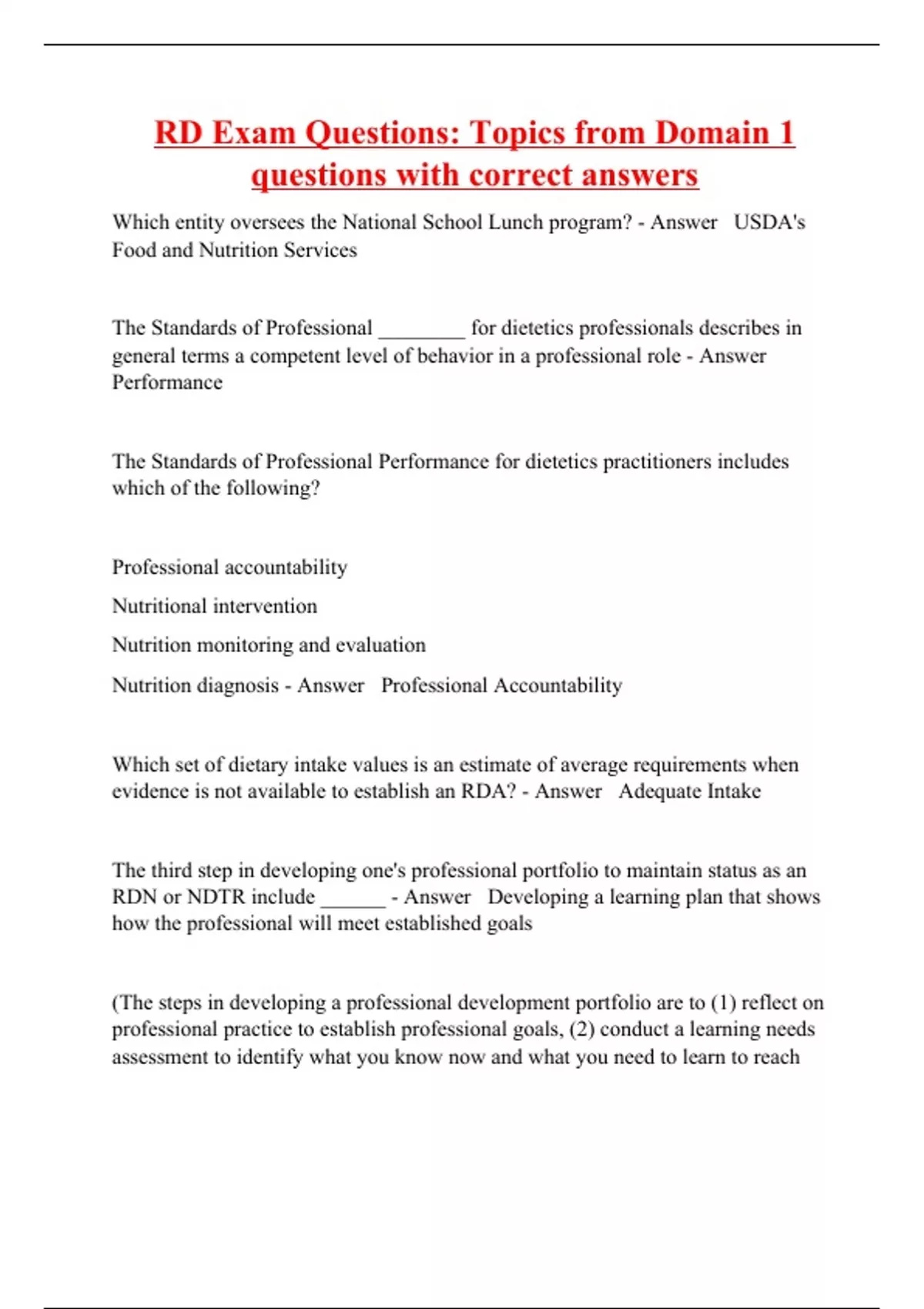 Which entity oversees the National School Lunch program? - Answer USDA's Food and Nutrition Services The Standards of Professional ________ for dietetics professionals describes in general terms a competent level of behavior in a professional role - Answer Performance The Standards of Professional Performance for dietetics practitioners includes which of the following? Professional accountability Nutritional intervention Nutrition monitoring and evaluation Nutrition diagnosis - Answer Professional Accountability Which set of dietary intake values is an estimate of average requirements when evidence is not available to establish an RDA? - Answer Adequate Intake The third step in developing one's professional portfolio to maintain status as an RDN or NDTR include ______ - Answer Developing a learning plan that shows how the professional will meet established goals (The steps in developing a professional development portfolio are to (1) reflect on professional practice to establish professional goals, (2) conduct a learning needs assessment to identify what you know now and wh