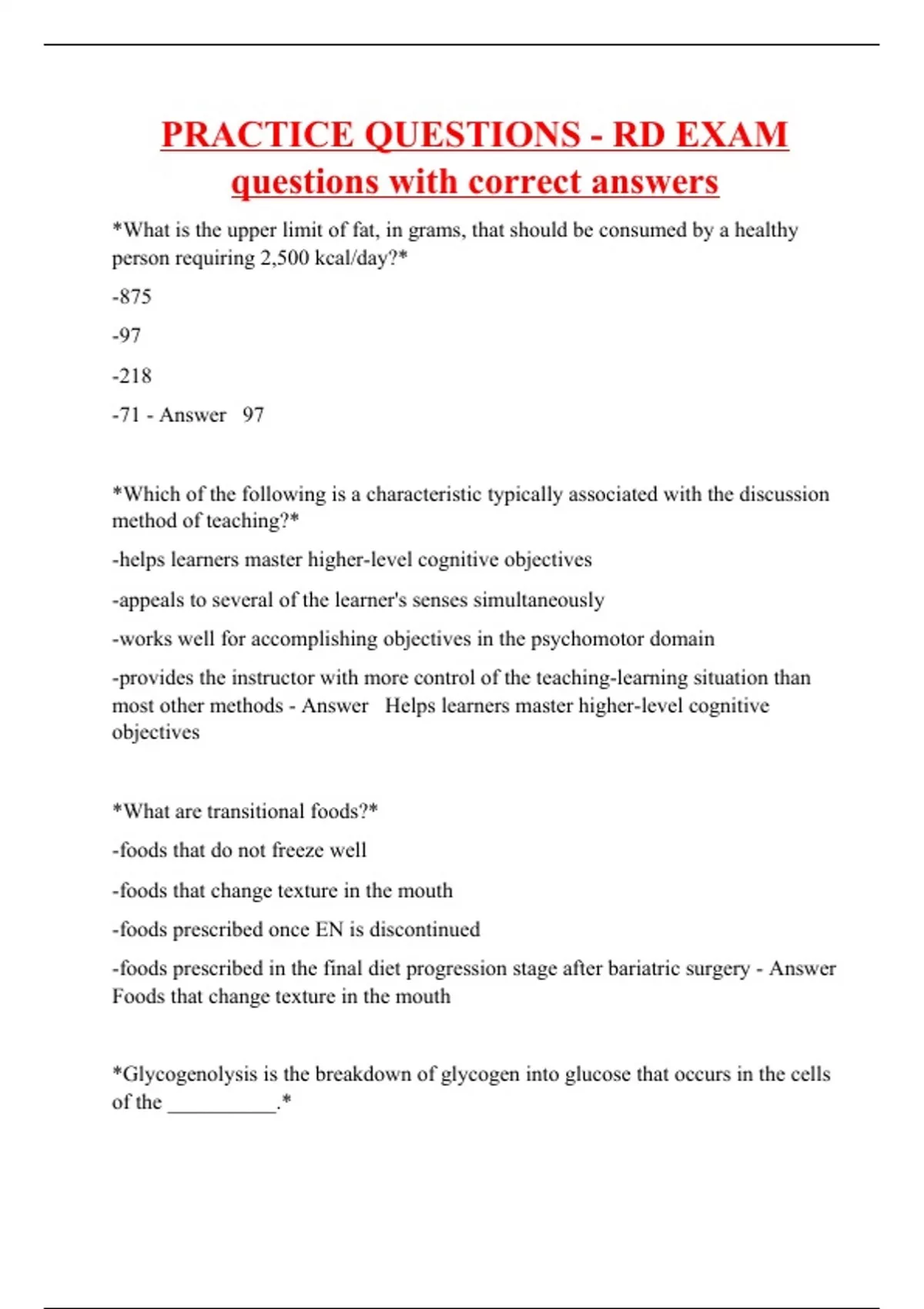 *What is the upper limit of fat, in grams, that should be consumed by a healthy person requiring 2,500 kcal/day?* -875 -97 -218 -71 - Answer 97 *Which of the following is a characteristic typically associated with the discussion method of teaching?* -helps learners master higher-level cognitive objectives -appeals to several of the learner's senses simultaneously -works well for accomplishing objectives in the psychomotor domain -provides the instructor with more control of the teaching-learning situation than most other methods - Answer Helps learners master higher-level cognitive objectives *What are transitional foods?* -foods that do not freeze well -foods that change texture in the mouth -foods prescribed once EN is discontinued