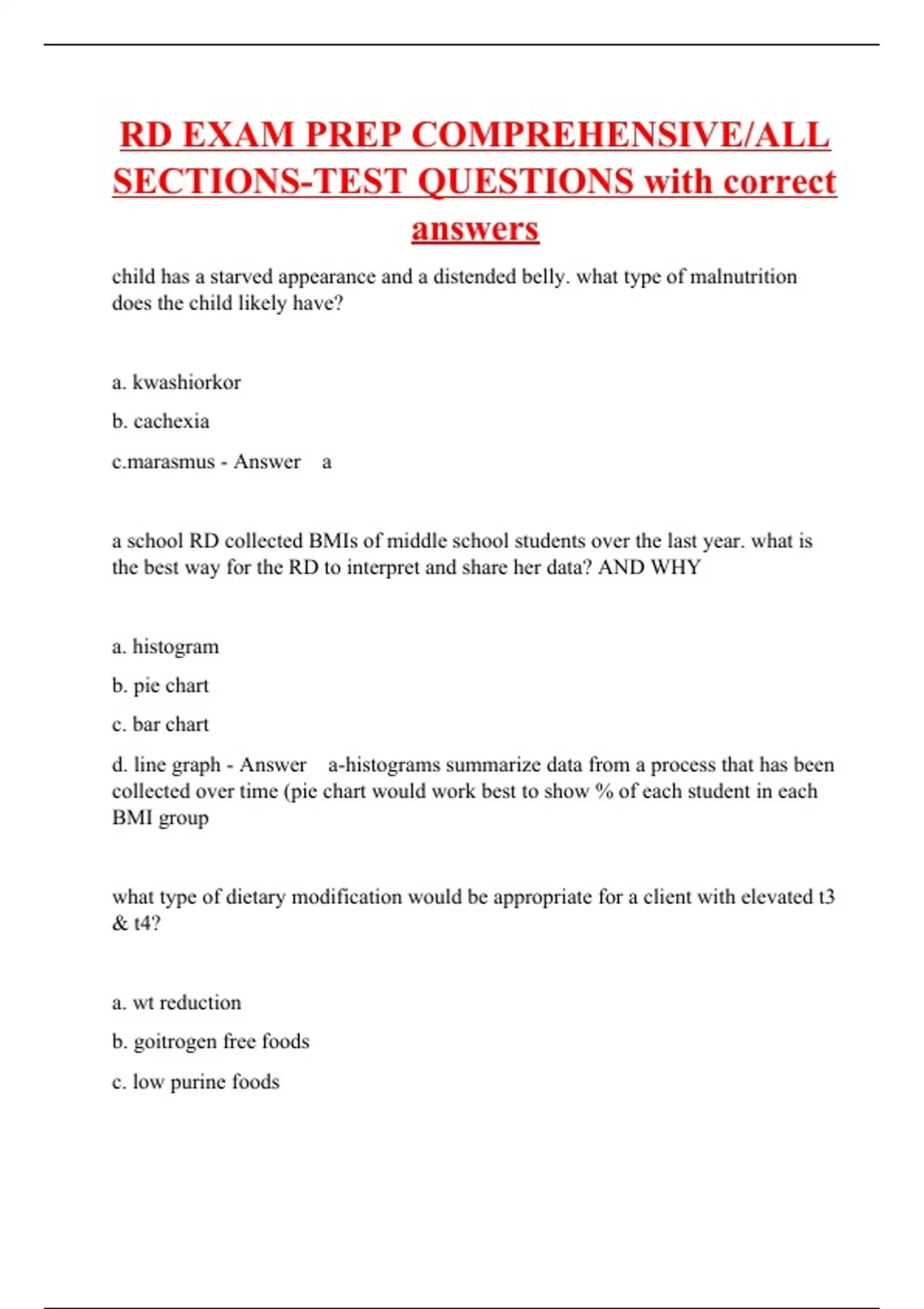 child has a starved appearance and a distended belly. what type of malnutrition does the child likely have? a. kwashiorkor b. cachexia mus - Answer a a school RD collected BMIs of middle school students over the last year. what is the best way for the RD to interpret and share her data? AND WHY a. histogram b. pie chart c. bar chart d. line graph - Answer a-histograms summarize data from a process that has been collected over time (pie chart would work best to show % of each student in each BMI group what type of dietary modification would be appropriate for a client with elevated t3 & t4? a. wt reduction b. goitrogen free foods c. low purine foods