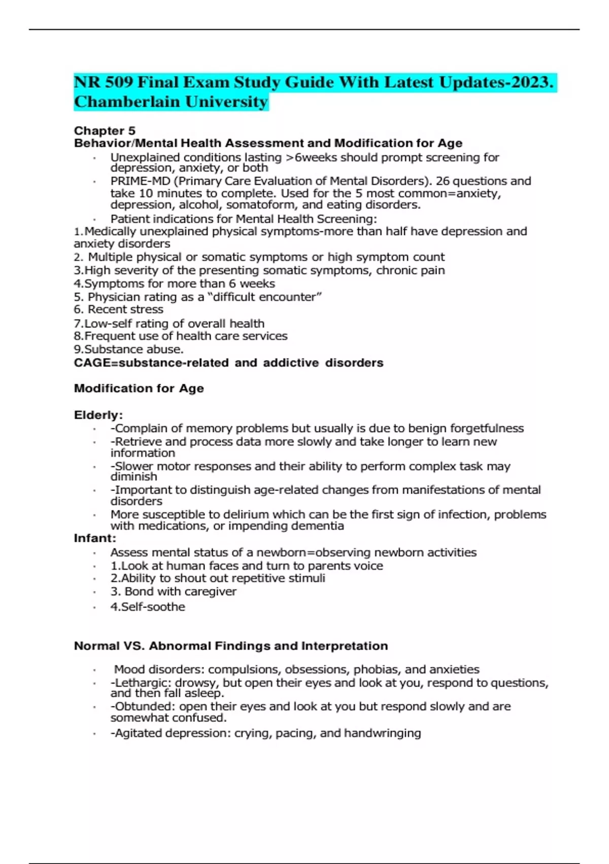 Summary NR 509 Final Exam Study Guide With Latest Updates-2023. Chamberlain University