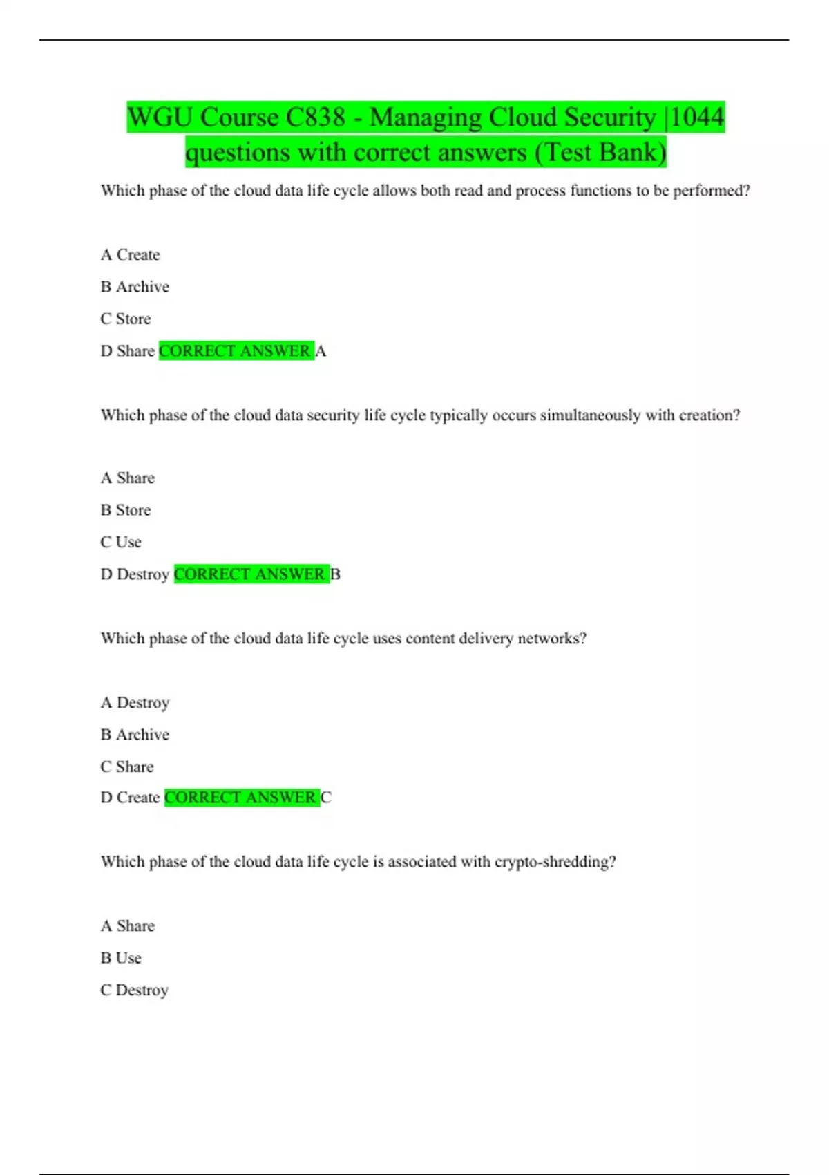 WGU Course C838 - Managing Cloud Security |1044 questions with correct answers (Test Bank)