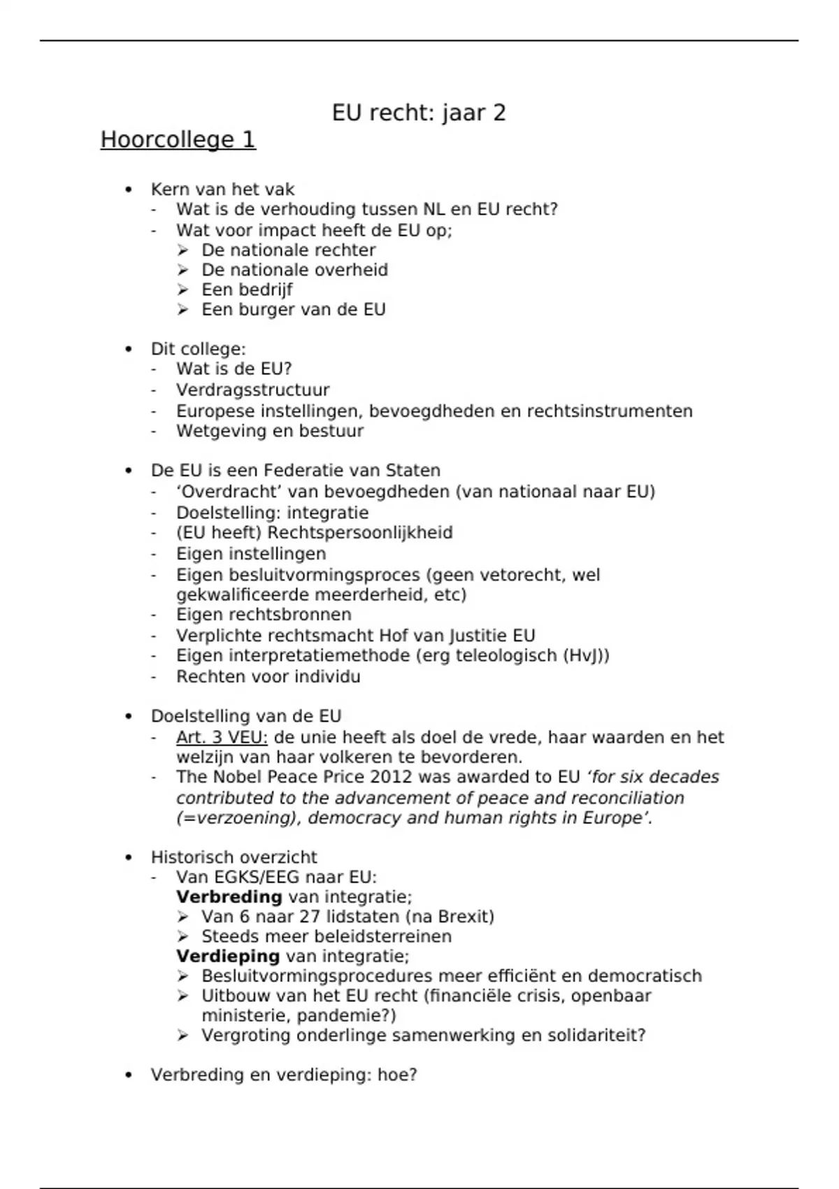 Dit document betreft een samenvatting van het EU-recht. Ik heb de eerste kans een 8 gehaald door het leren van deze samenvatting. In de samenvatting staan een aantal belangrijke elementen en aandachtspunten die genoemd zijn tijdens zowel de hoor- als werkcolleges die belangrijk zijn voor het tentamen (staan dus niet op de slides). Document is in het Nederlands.