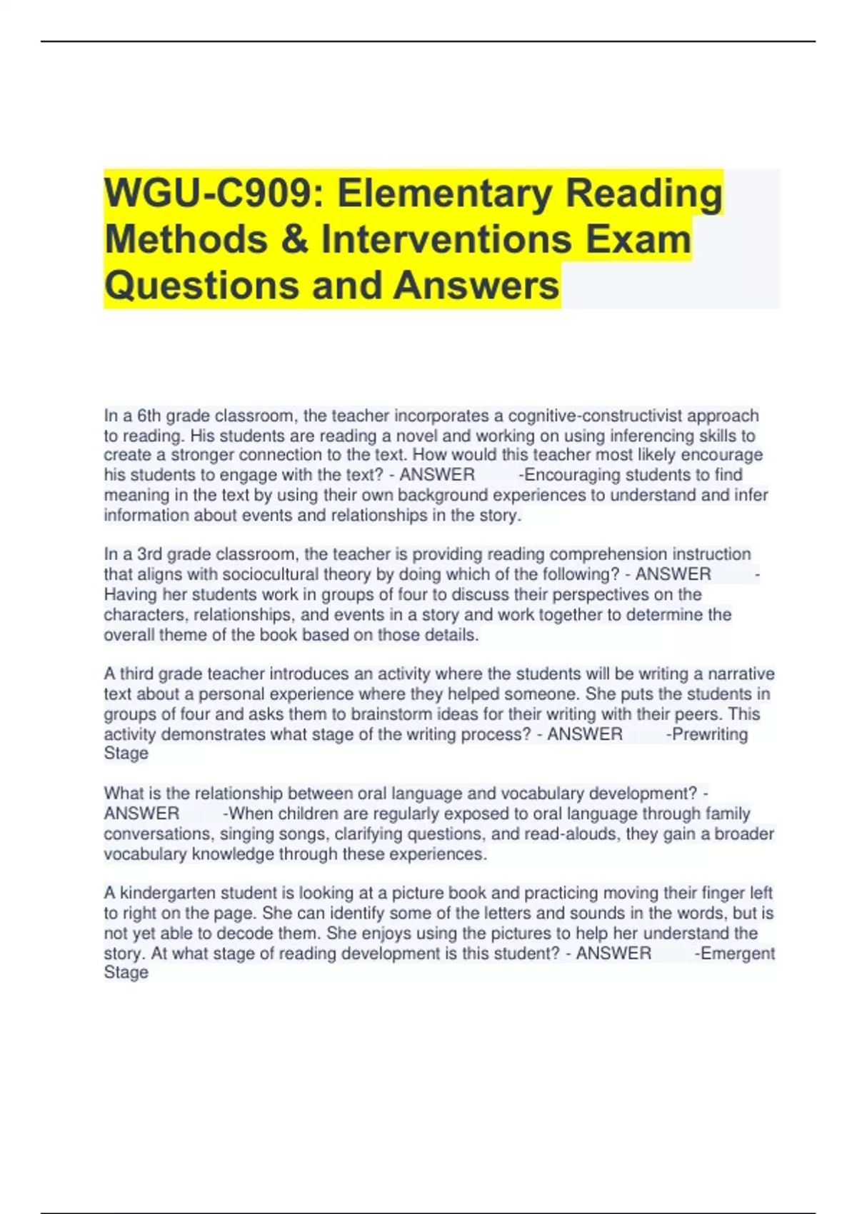 WGU-C909: Elementary Reading Methods & Interventions Exam Questions and Answers In a 6th grade classroom, the teacher incorporates a cognitive-constructivist approach to reading. His students are reading a novel and working on using inferencing skills to create a stronger connection to the text. How would this teacher most likely encourage his students to engage with the text? - ANSWER -Encouraging students to find meaning in the text by using their own background experiences to understand and infer information about events and relationships in the story. In a 3rd grade classroom, the teacher is providing reading comprehension instruction that aligns with sociocultural theory by doing which of the following? - ANSWER -Having her students work in groups of four to discuss their perspectives on the characters, relationships, and events in a story and work together to determine the overall theme of the book based on those details. A third grade teacher introduces an activity where the students will be writing a narrative text about a personal experience where they helped someone. She puts the students in groups of four and asks them to brainstorm ideas for their writing with their peers. This activity demonstrates what stage of the writing process? - ANSWER -Prewriting Stage What is the relationship between oral language and vocabulary development? - ANSWER -When children are regularly exposed to oral language through family conversations, singing songs, clarifying questions, and read-alouds, they gain a broader vocabulary knowledge through these experiences.