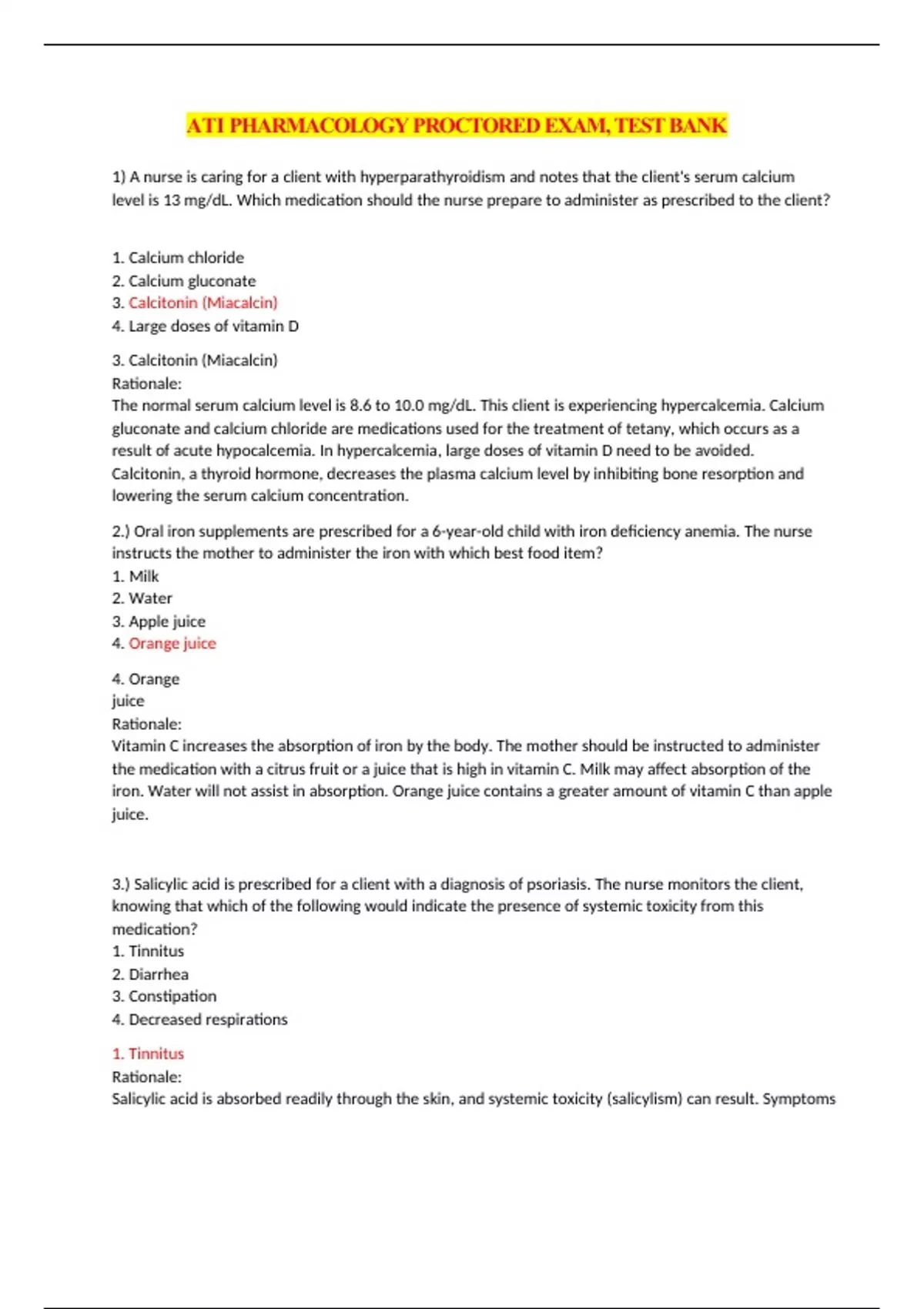 ATI PHARMACOLOGY PROCTORED EXAM, TEST BANK 1) A nurse is caring for a client with hyperparathyroidism and notes that the client's serum calcium level is 13 mg/dL. Which medication should the nurse prepare to administer as prescribed to the client? 1. Calcium chloride 2. Calcium gluconate 3. Calcitonin (Miacalcin) 4. Large doses of vitamin D 3. Calcitonin (Miacalcin) Rationale: The normal serum calcium level is 8.6 to 10.0 mg/dL. This client is experiencing hypercalcemia. Calcium gluconate and calcium chloride are medications used for the treatment of tetany, which occurs as a result of acute hypocalcemia. In hypercalcemia, large doses of vitamin D need to be avoided. Calcitonin, a thyroid hormone, decreases the plasma calcium level by inhibiting bone resorption and lowering the serum calcium concentration. 2.) Oral iron supplements are prescribed for a 6-year-old child with iron deficiency anemia. The nurse instructs the mother to administer the iron with which best food item? 1. Milk 2. Water 3. Apple juice 4. Orange juice 4. Orange juice Rationale: Vitamin C increases the absorption of iron by the body. The mother should be instructed to administer the medication with a citrus fruit or a juice that is high in vitamin C. Milk may affect absorption of the iron. Water will not assist in absorption. Orange juice contains a greater amount of vitamin C than apple juice.
