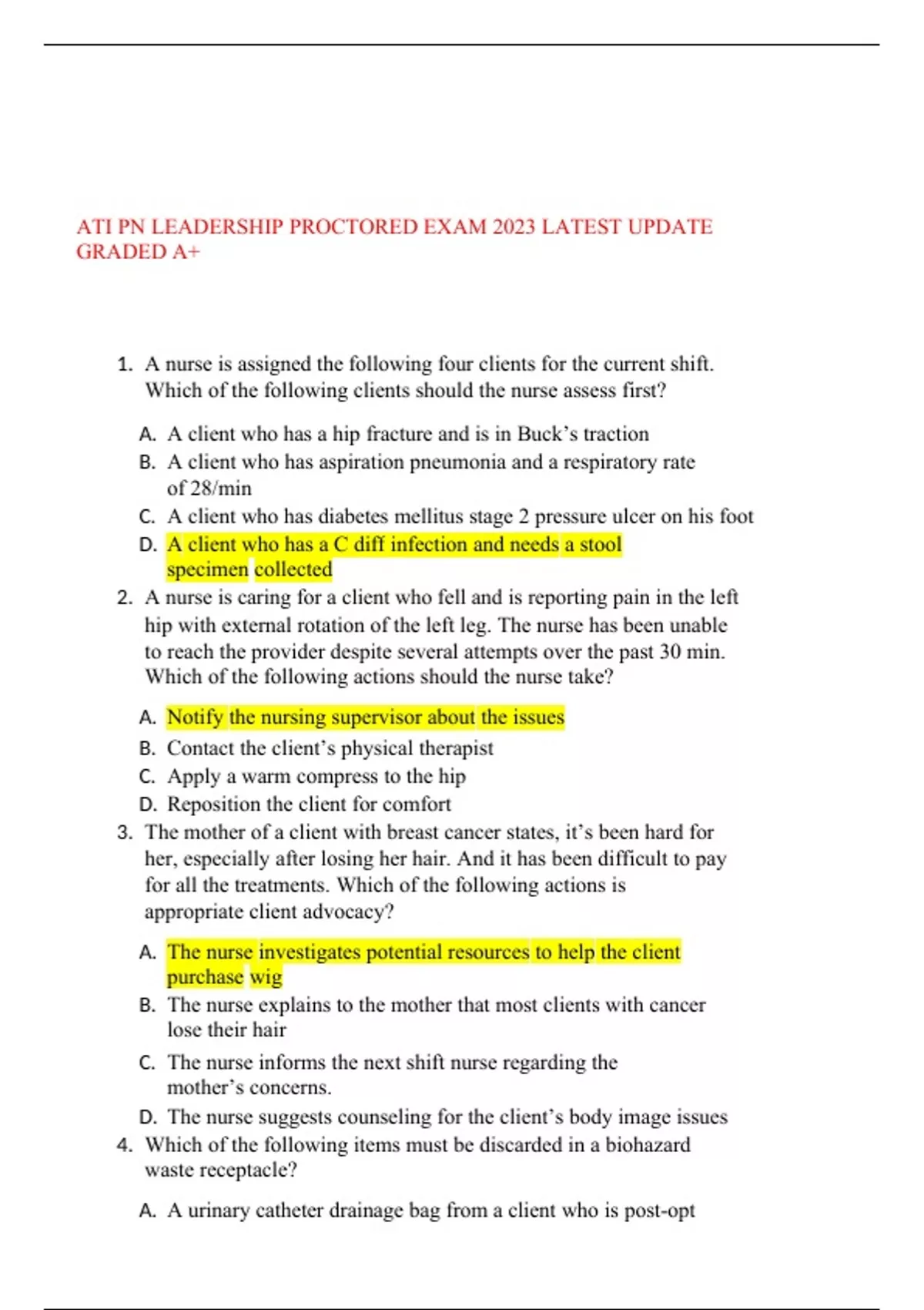 ATI PN LEADERSHIP PROCTORED EXAM 2023 LATEST UPDATE GRADED A+