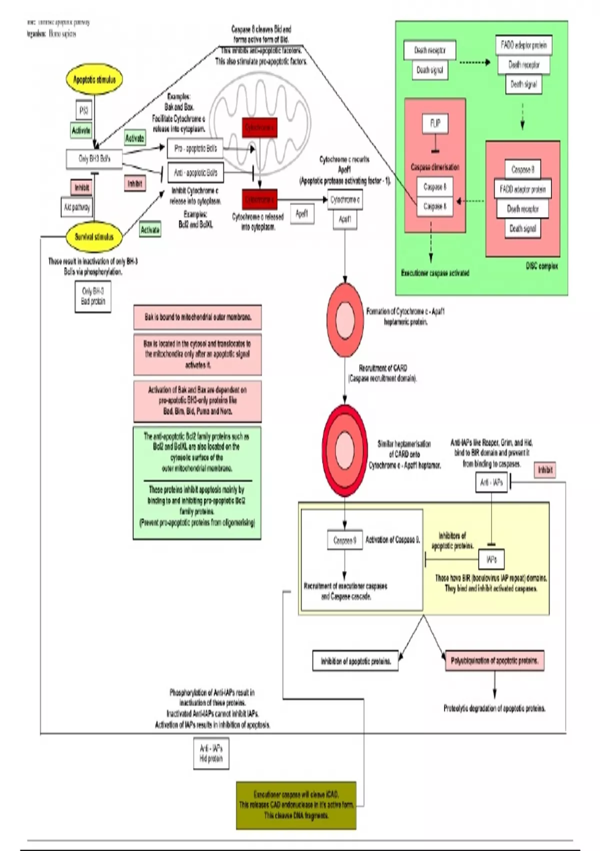 This is a diagram representing the extrinsic and intrinsic pathways for apoptosis (a.k.a programmed cell death). This also connects the two pathways and represent other factors (like IAPs, anti-IAPs, Only BH3-Bcl proteins) play role in apoptosis.