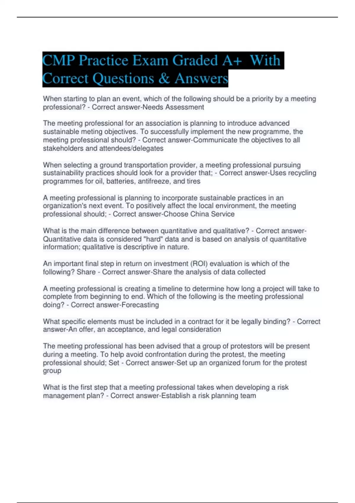 CMP Practice Exam Graded A+ With Correct Questions & Answers When starting to plan an event, which of the following should be a priority by a meeting professional? - Correct answer-Needs Assessment The meeting professional for an association is planning to introduce advanced sustainable meting objectives. To successfully implement the new programme, the meeting professional should? - Correct answer-Communicate the objectives to all stakeholders and attendees/delegates When selecting a ground transportation provider, a meeting professional pursuing sustainability practices should look for a provider that; - Correct answer-Uses recycling programmes for oil, batteries, antifreeze, and tires A meeting professional is planning to incorporate sustainable practices in an organization's next event. To positively affect the local environment, the meeting professional should; - Correct answer-Choose China Service What is the main difference between quantitative and qualitative? - Correct answer- Quantitative data is considered "hard" data and is based on analysis of quantitative information; qualitative is descriptive in nature. An important final step in return on investment (ROI) evaluation is which of the following? Share - Correct answer-Share the analysis of data collected A meeting professional is creating a timeline to determine how long a project will take to complete from beginning to end. Which of the following is the meeting professional doing? - Correct answer-Forecasting What specific elements must be included in a contract for it be legally binding? - Correct answer-An offer, an acceptance, and legal consideration The meeting professional has been advised that a group of protestors will be present during a meeting. To help avoid confrontation during the protest, the meeting professional should; Set - Correct answer-Set up an organized forum for the protest group What is the first step that a meeting professional takes when developing a risk management plan? - Correct answer-Establish a risk planning team The exhibition prospectus must include several items. Which of the following will be found somewhere other than the exhibition prospectus? - Correct answer-Exhibition booth/stand location A meeting professional is calculating the guest room budget for staff and speaker. The meeting professional has booked 200 rooms per night for 3 nights with a comp policy of 1:50 cumulative rooms. There is a need for 4-5 staff and speaker rooms per night. The history of the event shows no slippage. How many staff/speaker rooms should the meeting professional budget for? - Correct answer-3 rooms A meeting professional will be planning 5,000-person annual convention 18 months in advance planning timeline suggests the meeting planner should; - Correct answer- Develop the convention budget Which of the following should be considered when communicating desired meeting outcomes to volunteers? - Correct answer-Languages, customs, and general differences Volunteer position descriptions contain information that helps volunteers understand their role, responsibilities, and meeting host expectations. Which of the following items is a critical component of the volunteer position description? - Correct answer-Decision- making authority Which of the following stakeholders would measure success based on satisfaction score on evaluations? - Correct answer-Participant