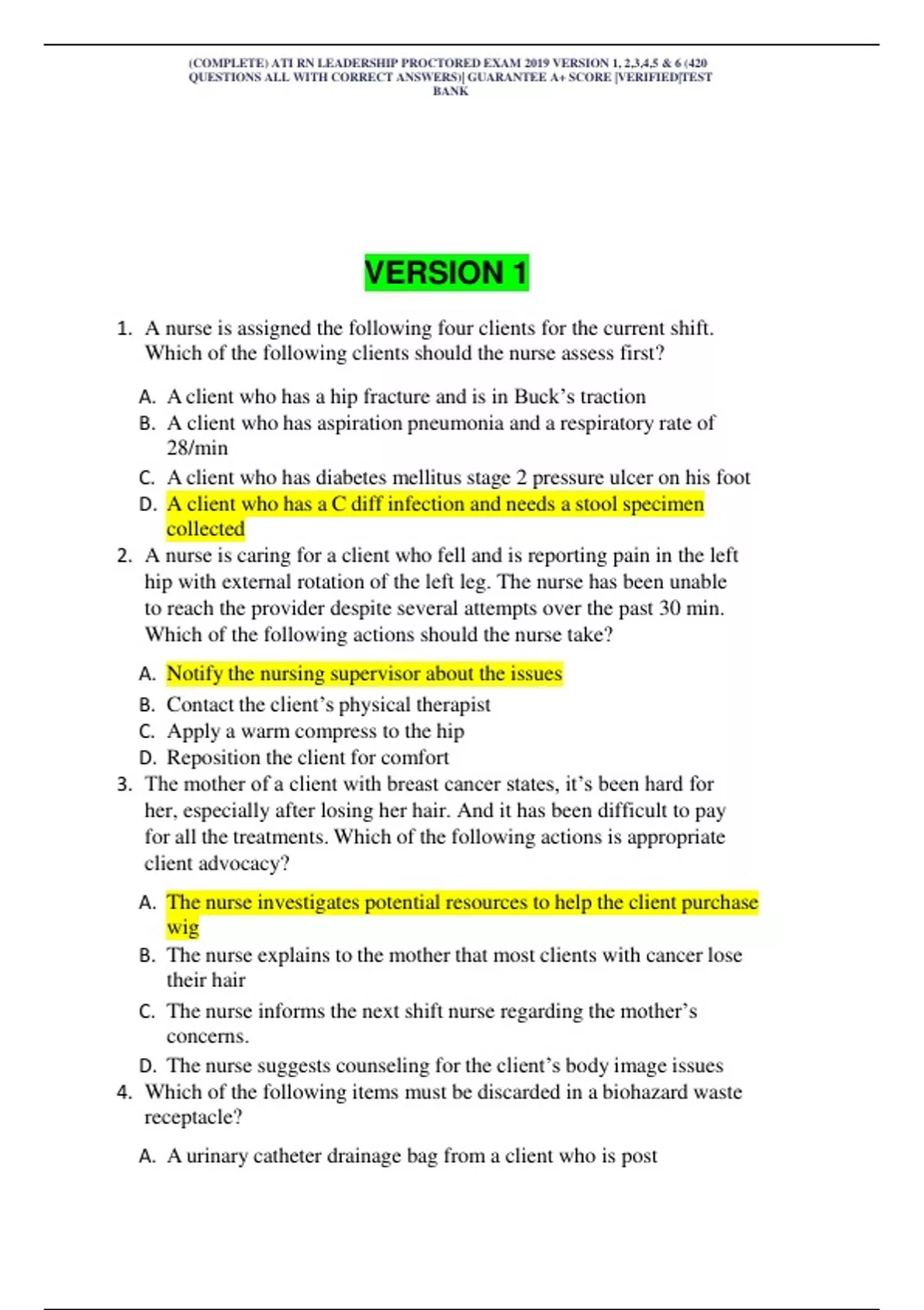 (COMPLETE) ATI RN LEADERSHIP PROCTORED EXAM 2019 VERSION 1, 2,3,4,5 & 6 (420 QUESTIONS ALL WITH CORRECT ANSWERS)| GUARANTEE A+ SCORE |VERIFIED|TEST BANK