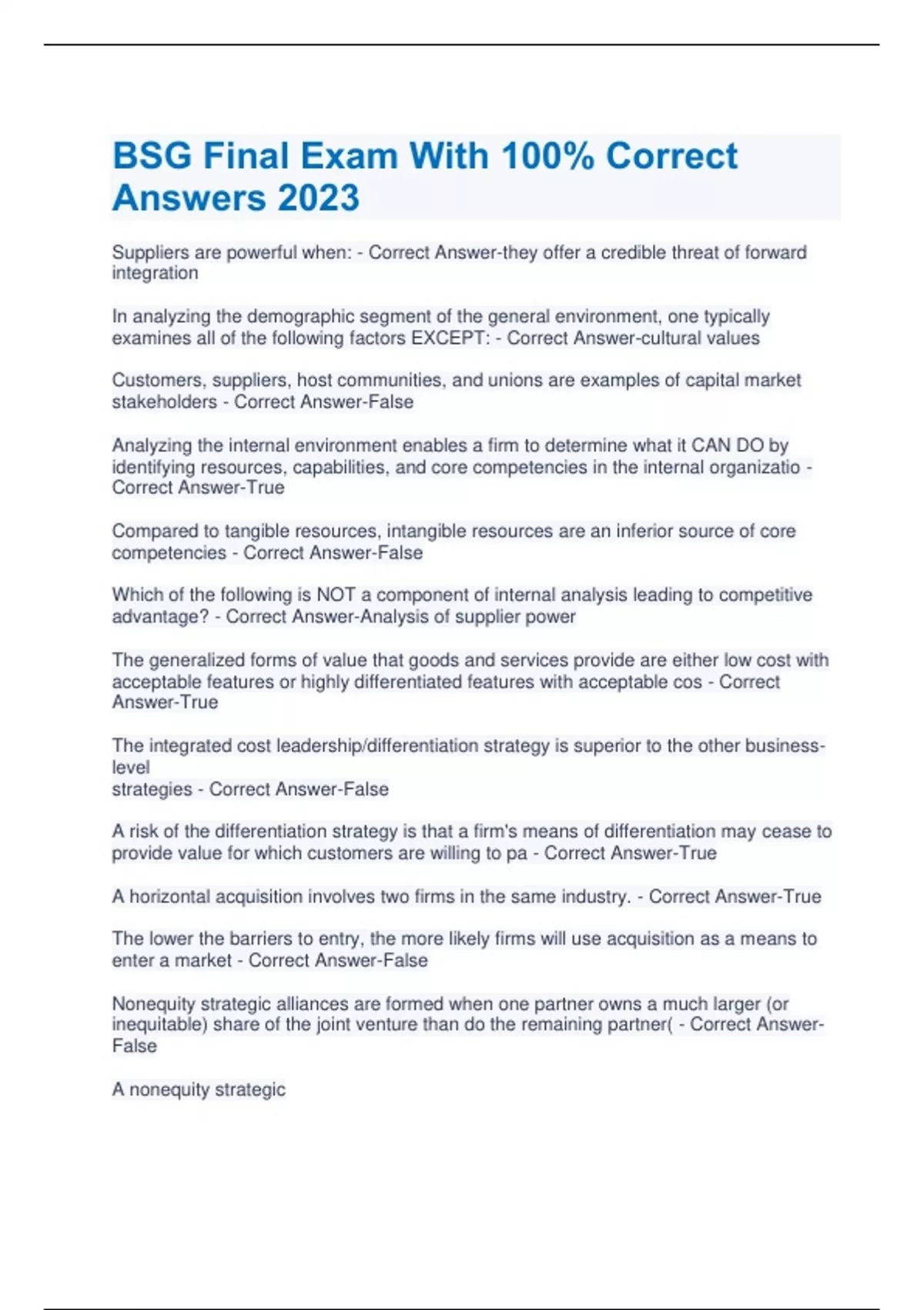 Suppliers are powerful when: - Correct Answer-they offer a credible threat of forward integration In analyzing the demographic segment of the general environment, one typically examines all of the following factors EXCEPT: - Correct Answer-cultural values Customers, suppliers, host communities, and unions are examples of capital market stakeholders - Correct Answer-False Analyzing the internal environment enables a firm to determine what it CAN DO by identifying resources, capabilities, and core competencies in the internal organizatio - Correct Answer-True Compared to tangible resources, intangible resources are an inferior source of core competencies - Correct Answer-False Which of the following is NOT a component of internal analysis leading to competitive advantage? - Correct Answer-Analysis of supplier power The generalized forms of value that goods and services provide are either low cost with acceptable features or highly differentiated features with acceptable cos - Correct Answer-True The integrated cost leadership/differentiation strategy is superior to the other businesslevel strategies - Correct Answer-False A risk of the differentiation strategy is that a firm's means of differentiation may cease to provide value for which customers are willing to pa - Correct Answer-True A horizontal acquisition involves two firms in the same industry. - Correct Answer-True The lower the barriers to entry, the more likely firms will use acquisition as a means to enter a market - Correct Answer-False Nonequity strategic alliances are formed when one partner owns a much larger (or inequitable) share of the joint venture than do the remaining partner( - Correct AnswerFalse A nonequity strategic