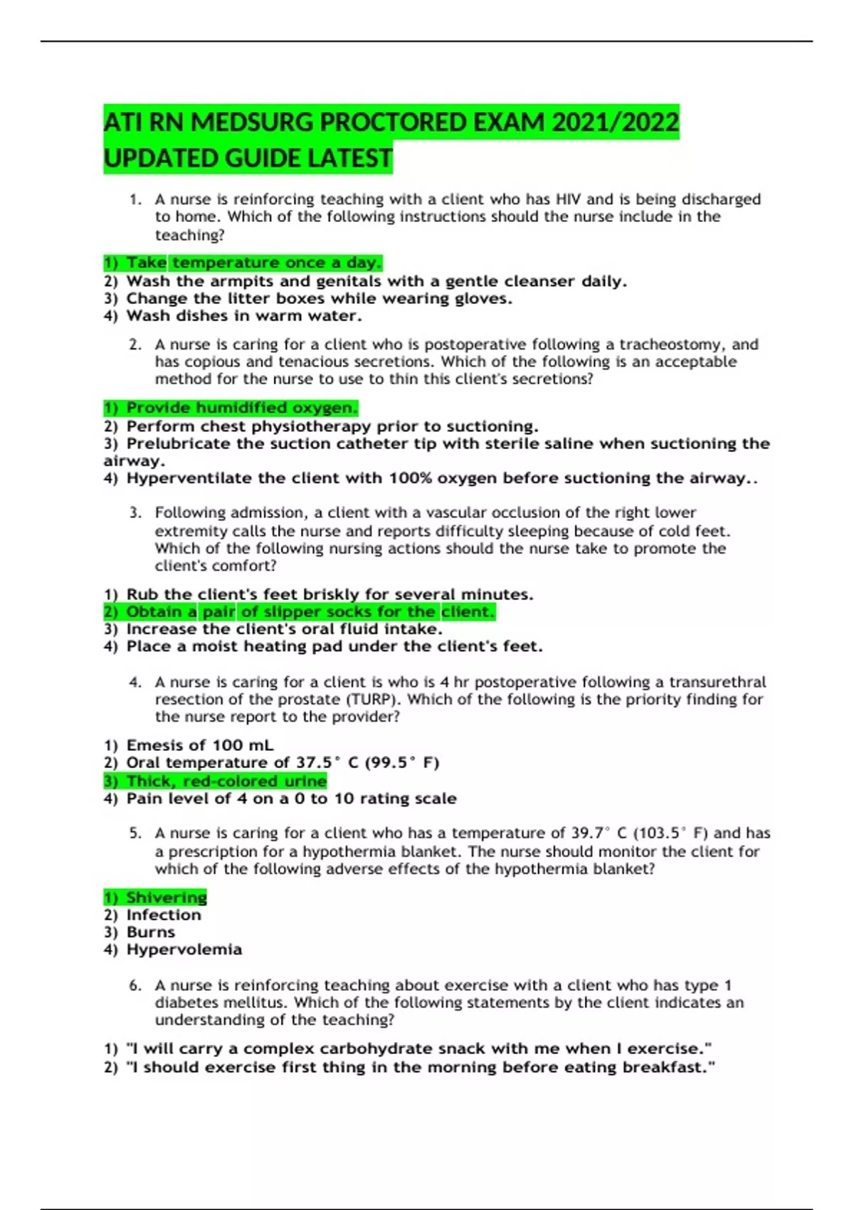 1. A nurse is reinforcing teaching with a client who has HIV and is being discharged to home. Which of the following instructions should the nurse include in the teaching? 1) Take temperature once a day. 2) Wash the armpits and genitals with a gentle cleanser daily. 3) Change the litter boxes while wearing gloves. 4) Wash dishes in warm water. 2. A nurse is caring for a client who is postoperative following a tracheostomy, and has copious and tenacious secretions. Which of the following is an acceptable method for the nurse to use to thin this client's secretions? 1) Provide humidified oxygen. 2) Perform chest physiotherapy prior to suctioning. 3) Prelubricate the suction catheter tip with sterile saline when suctioning the airway. 4) Hyperventilate the client with 100% oxygen before suctioning the airway.. 3. Following admission, a client with a vascular occlusion of the right lower extremity calls the nurse and reports difficulty sleeping because of cold feet. Which of the following nursing actions should the nurse take to promote the client's comfort? 1) Rub the client's feet briskly for several minutes. 2) Obtain a pair of slipper socks for the client. 3) Increase the client's oral fluid intake. 4) Place a moist heating pad under the client's feet. 4. A nurse is caring for a client is who is 4 hr postoperative following a transurethral resection of the prostate (TURP). Which of the following is the priority finding for the nurse report to the provider? 1) Emesis of 100 mL 2) Oral temperature of 37.5° C (99.5° F) 3) Thick, red-colored urine 4) Pain level of 4 on a 0 to 10 rating scale 5. A nurse is caring for a client who has a temperature of 39.7° C (103.5° F) and has a prescription for a hypothermia blanket. The nurse should monitor the client for which of the following adverse effects of the hypothermia blanket? 1) Shivering 2) Infection 3) Burns 4) Hypervolemia 6. A nurse is reinforcing teaching about exercise with a client who has type 1 diabetes mellitus. Which of the following statements by the client indicates an understanding of the teaching? 1) "I will carry a complex carbohydrate snack with me when I exercise." 2) "I should exercise first thing in the morning before eating breakfast." 3) "I should avoid injecting insulin into my thigh if I am going to go running." 4) "I will not exercise if my urine is positive for ketones." 7. A nurse notes a small section of bowel protruding from the abdominal incision of a client who is postoperative. After calling for assistance, which of the following actions should the nurse take first? 1) Cover the client's wound with a moist, sterile dressing. 2) Have the client lie supine with knees flexed. 3) Check the client's vital signs. 4) Inform the client about the need to return to surgery. 8. A nurse is collecting data from a client who has alcohol use disorder and is experiencing metabolic acidosis. Which of the following manifestations should the nurse expect? 1) Cool, clammy skin. 2) Hyperventilation 3) Increased blood pressure 4) Bradycardia 9. A nurse is reinforcing discharge teaching with a client following a cataract extraction. Which of the following should the nurse include in the teaching? 1) Avoid bending at the waist. 2) Remove the eye shield at bedtime. 3) Limit the use of laxatives if constipated. 4) Seeing flashes of light is an expected finding following extraction. 10. A nurse is caring for a client who has heart failure and has been taking digoxin 0.25 mg daily. The client refuses breakfast and reports nausea. Which of the following actions should the nurse take first? 1) Suggest that the client rests before eating the meal. 2) Request a dietary consult. 3) Check the client's vital signs. 4) Request an order for an antiemetic. 11. A nurse is caring for a client who is 3 days postoperative following a cholecystectomy. The nurse suspects the client's wound is infected because the drainage from the dressing is yellow and thick. Which of the following findings should the nurse report as the type of drainage found? 1) Sanguineous 2) Serous 3) Serosanguineous 4) Purulent 12. A nurse is reinforcing discharge teaching to a client following arthroscopic surgery. To prevent postoperative complications which of the following actions should be reinforced during the teaching? 1) Administer an opioid analgesic to the client 30 min prior to initiating CPM exercises. 2) Place the client’s affected leg into the CPM machine with the machine in the flexed position. 3) Place the client into a high Fowler’s position when initiating the CPM exercises. 4) Align the joints of the CPM machine with the knee gatch in the client’s bed. ....................................................................................................CONTINUE.