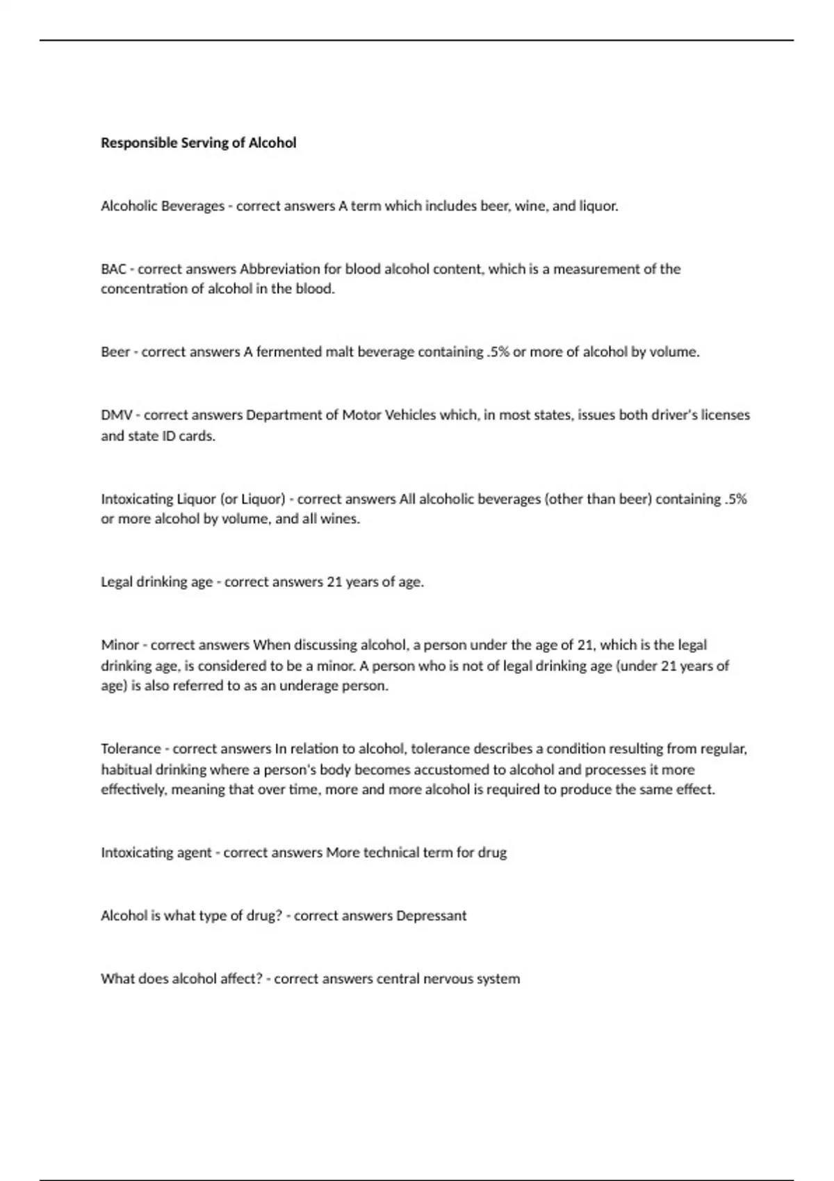 Alcoholic Beverages - correct answers A term which includes beer, wine, and liquor. BAC - correct answers Abbreviation for blood alcohol content, which is a measurement of the concentration of alcohol in the blood. Beer - correct answers A fermented malt beverage containing .5% or more of alcohol by volume. DMV - correct answers Department of Motor Vehicles which, in most states, issues both driver's licenses and state ID cards. Intoxicating Liquor (or Liquor) - correct answers All alcoholic beverages (other than beer) containing .5% or more alcohol by volume, and all wines. Legal drinking age - correct answers 21 years of age. Minor - correct answers When discussing alcohol, a person under the age of 21, which is the legal drinking age, is considered to be a minor. A person who is not of legal drinking age (under 21 years of age) is also referred to as an underage person. Tolerance - correct answers In relation to alcohol, tolerance describes a condition resulting from regular, habitual drinking where a person's body becomes accustomed to alcohol and processes it more effectively, meaning that over time, more and more alcohol is required to produce the same effect. Intoxicating agent - correct answers More technical term for drug Alcohol is what type of drug? - correct answers Depressant What does alcohol affect? - correct answers central nervous system BAC expressed as a percentage: - correct answers A widely accepted estimate of BAC is two standard drinks consumed in one hour result in a BAC of approximately 0.04%. Further consumption of one drink per hour will sustain that level. Legal BAC limit to operate a motor vehicle: - correct answers An individual is considered to be driving while intoxicated if the BAC meets or exceeds .08%. There are numerous factors that affect intoxication including: - correct answers Rate. The rate at which alcohol is consumed determines how quickly the alcohol enters the bloodstream. A well-functioning liver is capable of processing about ½ ounce of alcohol per hour. Consuming more than this will increase alcohol levels in the bloodstream. Weight and Body Fat. In general, someone that is heavier requires greater amounts of alcohol to reach a higher BAC. But body fat actually contributes to higher BAC than does muscle, so this generalization is not always accurate. Body Water. The amount of water in an individual's body also affects the level of intoxication that may occur. The water in the average male's body is estimated at 58%, while a woman is estimated to have about 49% water. In general, the more water in the body, the more alcohol it takes to reach a higher BAC. Overall Health. A healthy body is capable of processing alcohol more efficiently than one that is weakened from illness, injury or other stressors. Mental State & Environment. Alcohol tends to exaggerate emotion, so an individual's state of mind can affect intoxication. The level of comfort the person feels in their surroundings may also affect the rate of drinking and overall intoxication. A party at the local bar versus a cocktail party at an upscale lounge may produce different BACs due to anticipation or anxiety. Drug Use. The use of any medication, such as prescription, over the counter, illicit or unrecognized drugs when mixed with alcohol may produce unwanted physical reactions. Be aware and cautious of the additive and synergistic effects of combining drugs with alcohol. Age. As people age, so do their organs. Liver function may be less efficient in older people, so their ability to process alcohol will be diminished. Tolerance. Regular drinking can lead to a condition known as tolerance. This means the individual's body is accustomed to alcohol and processes it rather effectively. Over time, more alcohol is required to produce the same effect. Drinkers who have developed a tolerance will not show the same outward signs of intoxication as inexperienced drinkers, but they will still have a high BAC. Obvious intoxication - correct answers In virtually every state in the US, including California, the sale of alcohol to a person who is obviously intoxicated is illegal. Do your best to remove alcohol from their possession. Good Faith Effort - correct answers In California, those who cannot care for themselves may be arrested and charged with disorderly conduct, so a responsible server should take steps to remove such a customer from the establishment and promote safe transportation if possible. ABC - correct answers In California, the Department of Alcoholic Beverage Control (ABC) is the governmental entity that regulates the manufacture, importation, and sale of alcoholic beverages, as well as issuing the approval, denial, revocation, or suspension of alcoholic beverage licenses. The department was created by constitutional amendment in 1955 and is an independent part of the executive branch of the State government. The ABC also oversees Responsible Beverage Service (RBS) training providers and content. Legal restrictions - correct answers Legal Age to Consume . . . . . . . 21 Legal Age to Sell . . . . . . . . . . . . 18 (or under) with restrictions* Legal Age to Serve . . . . . . . . . . 18 with restrictions** *A person 18 or older may sell alcoholic beverages at an off-sale establishment (for consumption off premises) unsupervised. Persons age 17 and imageyounger may sell alcohol if under the continuous supervision of a person 21 or older. **Any person between 18 and 21 is allowed to serve any alcoholic beverage in an area primarily designed and used for the sale and service of food for consumption on the premises (on-sale). Bartenders and cocktail waitresses must be 21.