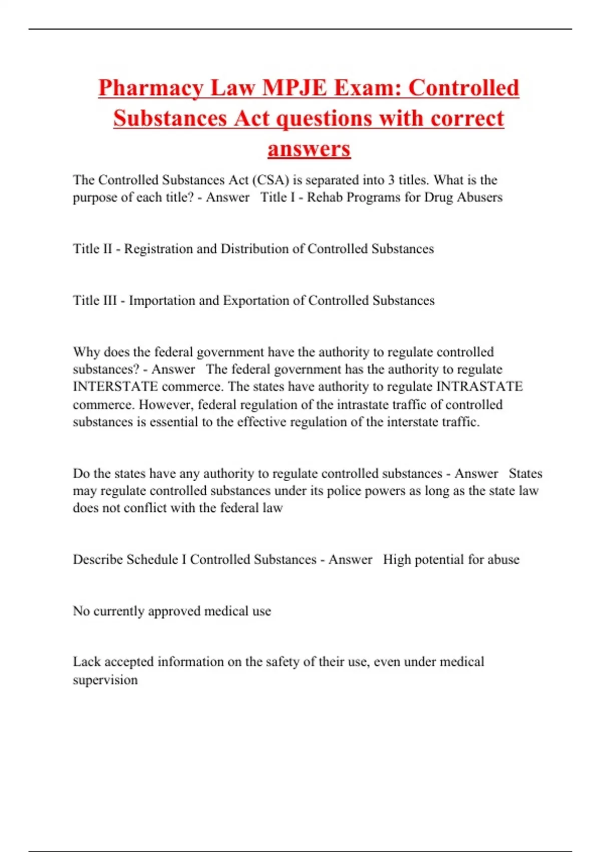 The Controlled Substances Act (CSA) is separated into 3 titles. What is the purpose of each title? - Answer Title I - Rehab Programs for Drug Abusers Title II - Registration and Distribution of Controlled Substances Title III - Importation and Exportation of Controlled Substances Why does the federal government have the authority to regulate controlled substances? - Answer The federal government has the authority to regulate INTERSTATE commerce. The states have authority to regulate INTRASTATE commerce. However, federal regulation of the intrastate traffic of controlled substances is essential to the effective regulation of the interstate traffic. Do the states have any authority to regulate controlled substances - Answer States may regulate controlled substances under its police powers as long as the state law does not conflict with the federal law Describe Schedule I Controlled Substances - Answer High potential for abuse No currently approved medical use Lack accepted information on the safety of their use, even under medical supervision