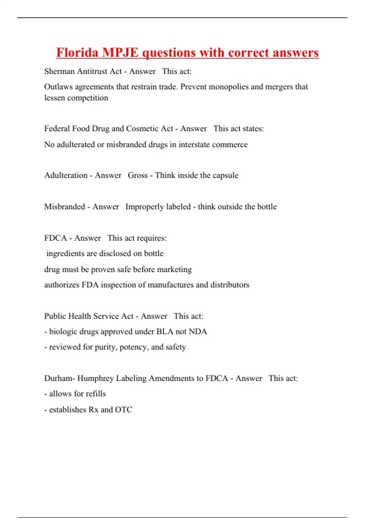 Sherman Antitrust Act - Answer This act: Outlaws agreements that restrain trade. Prevent monopolies and mergers that lessen competition Federal Food Drug and Cosmetic Act - Answer This act states: No adulterated or misbranded drugs in interstate commerce Adulteration - Answer Gross - Think inside the capsule Misbranded - Answer Improperly labeled - think outside the bottle FDCA - Answer This act requires: ingredients are disclosed on bottle drug must be proven safe before marketing authorizes FDA inspection of manufactures and distributors Public Health Service Act - Answer This act: - biologic drugs approved under BLA not NDA - reviewed for purity, potency, and safety Durham- Humphrey Labeling Amendments to FDCA - Answer This act: - allows for refills - establishes Rx and OTC OTC requirements of Durham-Humphrey - Answer This act states: - must be labeled with adequate directions for use (drug facts label)