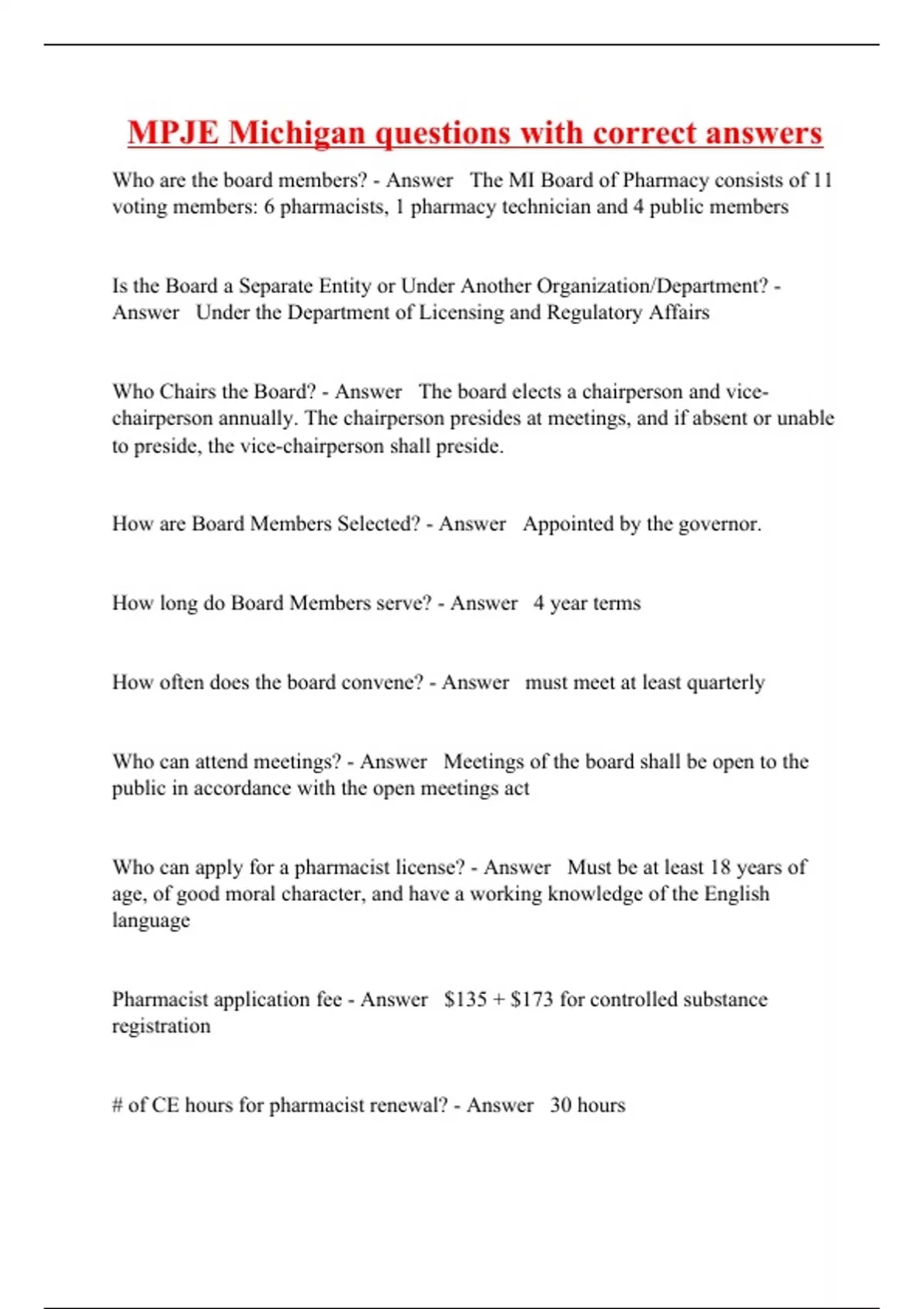 Who are the board members? - Answer The MI Board of Pharmacy consists of 11 voting members: 6 pharmacists, 1 pharmacy technician and 4 public members Is the Board a Separate Entity or Under Another Organization/Department? - Answer Under the Department of Licensing and Regulatory Affairs Who Chairs the Board? - Answer The board elects a chairperson and vice-chairperson annually. The chairperson presides at meetings, and if absent or unable to preside, the vice-chairperson shall preside. How are Board Members Selected? - Answer Appointed by the governor. How long do Board Members serve? - Answer 4 year terms How often does the board convene? - Answer must meet at least quarterly Who can attend meetings? - Answer Meetings of the board shall be open to the public in accordance with the open meetings act Who can apply for a pharmacist license? - Answer Must be at least 18 years of age, of good moral character, and have a working knowledge of the English language Pharmacist application fee - Answer $135 + $173 for controlled substance registration