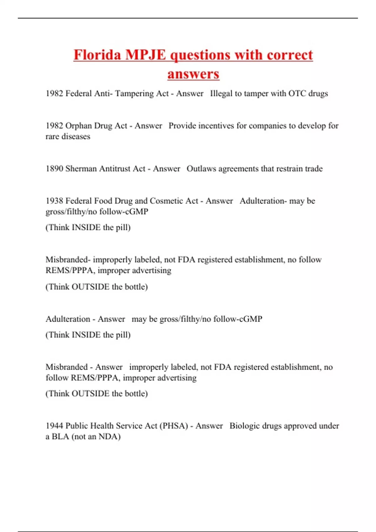 1982 Federal Anti- Tampering Act - Answer Illegal to tamper with OTC drugs 1982 Orphan Drug Act - Answer Provide incentives for companies to develop for rare diseases 1890 Sherman Antitrust Act - Answer Outlaws agreements that restrain trade 1938 Federal Food Drug and Cosmetic Act - Answer Adulteration- may be gross/filthy/no follow-cGMP (Think INSIDE the pill) Misbranded- improperly labeled, not FDA registered establishment, no follow REMS/PPPA, improper advertising (Think OUTSIDE the bottle) Adulteration - Answer may be gross/filthy/no follow-cGMP (Think INSIDE the pill) Misbranded - Answer improperly labeled, not FDA registered establishment, no follow REMS/PPPA, improper advertising (Think OUTSIDE the bottle)