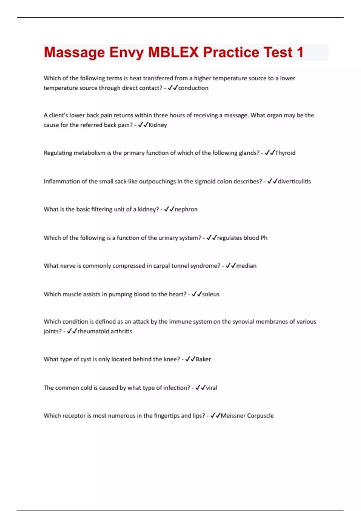 Which of the following terms is heat transferred from a higher temperature source to a lower temperature source through direct contact? - conduction A client's lower back pain returns within three hours of receiving a massage. What organ may be the cause for the referred back pain? - Kidney Regulating metabolism is the primary function of which of the following glands? - Thyroid Inflammation of the small sack-like outpouchings in the sigmoid colon describes? - diverticulitis What is the basic filtering unit of a kidney? - nephron Which of the following is a function of the urinary system? - regulates blood Ph What nerve is commonly compressed in carpal tunnel syndrome? - median Which muscle assists in pumping blood to the heart? - soleus Which condition is defined as an attack by the immune system on the synovial membranes of various joints? - rheumatoid arthritis What type of cyst is only located behind the knee? - Baker The common cold is caused by what type of infection? - viral Which receptor is most numerous in the fingertips and lips? - Meissner Corpuscle