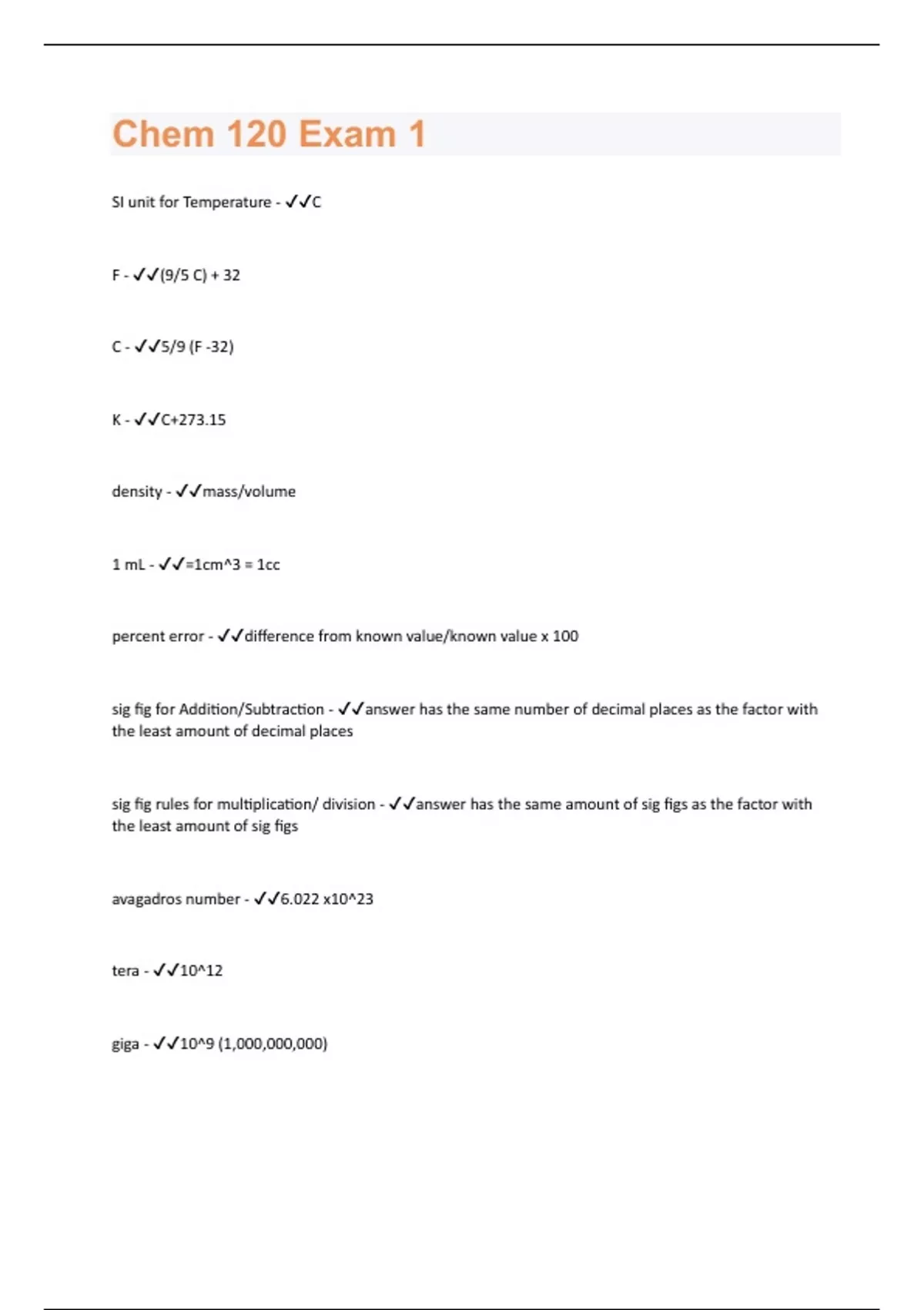 SI unit for Temperature - C F - (9/5 C) + 32 C - 5/9 (F -32) K - C+273.15 density - mass/volume 1 mL - =1cm^3 = 1cc percent error - difference from known value/known value x 100 sig fig for Addition/Subtraction - answer has the same number of decimal places as the factor with the least amount of decimal places sig fig rules for multiplication/ division - answer has the same amount of sig figs as the factor with the least amount of sig figs avagadros number - 6.022 x10^23 tera - 10^12 giga - 10^9 (1,000,000,000)