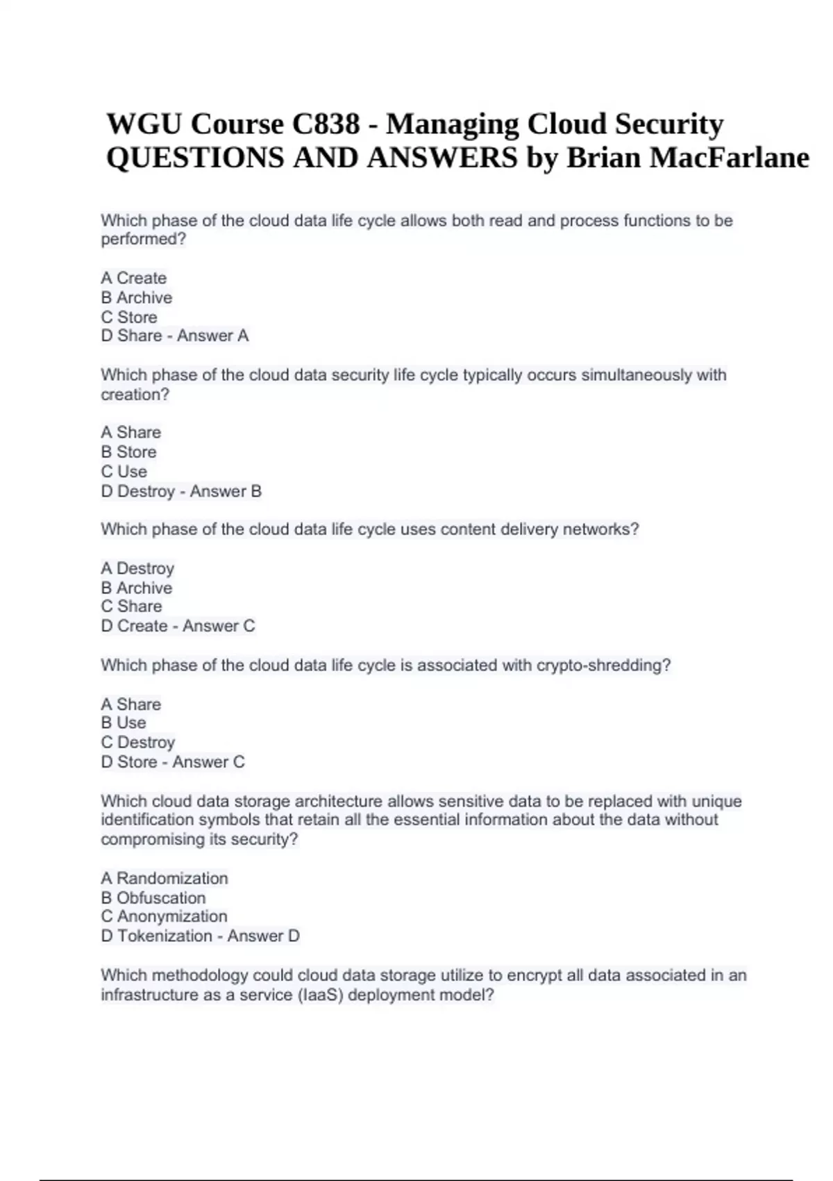 WGU Course C838 - Managing Cloud Security QUESTIONS AND ANSWERS by Brian MacFarlane.