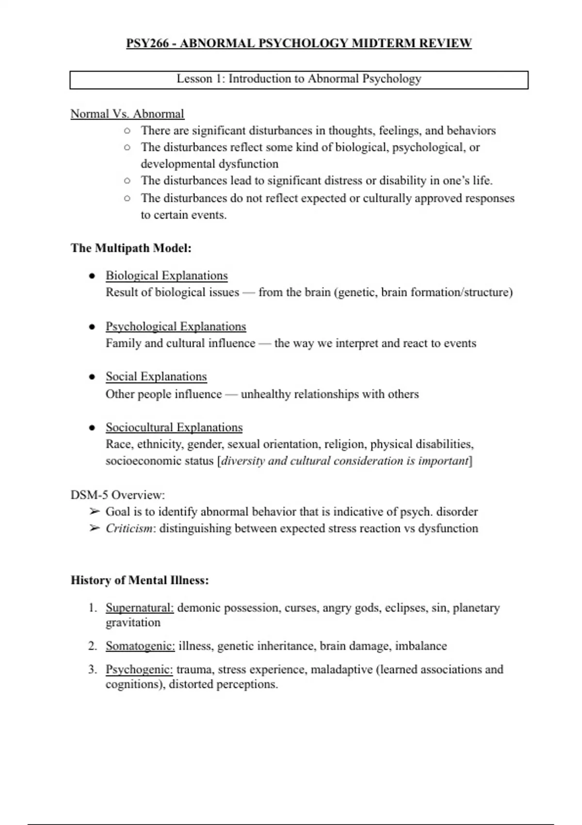 Jam-packed midterm review guide covering extensive and vital information from lessons 1 through 6 from the PSY266 (Abnormal Psychology) course. Lesson 1 overviews the introduction to abnormal psychology Lesson 2 overviews the DSM-5 Lesson 3 overviews anxiety, obsessive-compulsive and trauma-stress disorders Lesson 4 overviews depressive disorders, bipolar disorder, and suicide Lesson 5 overviews feeding, eating disorders and sleep-wake disorders Lesson 6 overviews substance use disorders and addiction