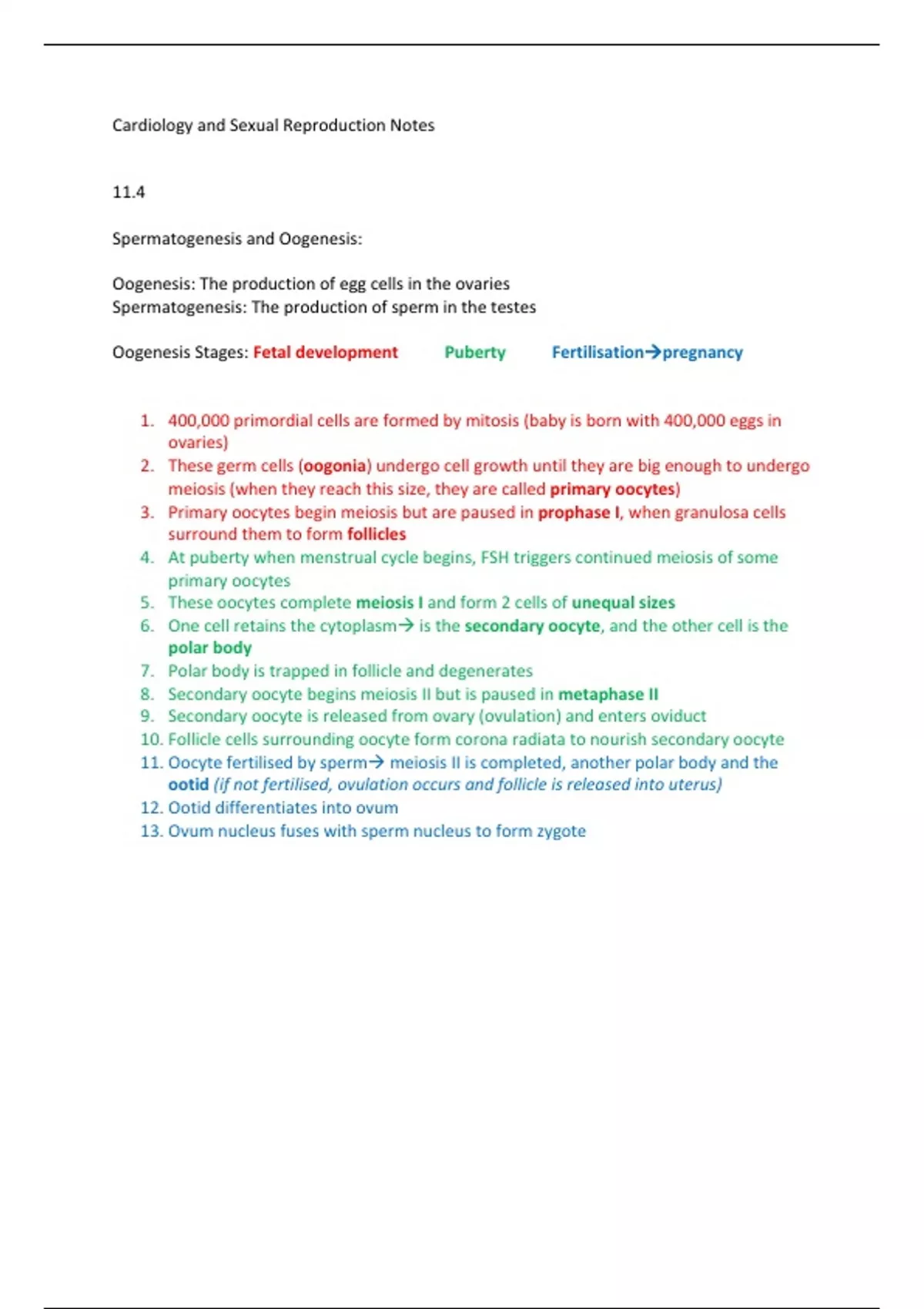 IB Biology, SL and HL content for cardiology, menstrual hormones, pregnancy and sexual reproduction. Includes: description of stages of oogenesis and spermatogenesis | description and explanation of hormones and feedback loops | stages of the menstrual cycle | pregnancy and the role of hCG and oxytocin | systole and diastole | structure & function of different types of blood vessels