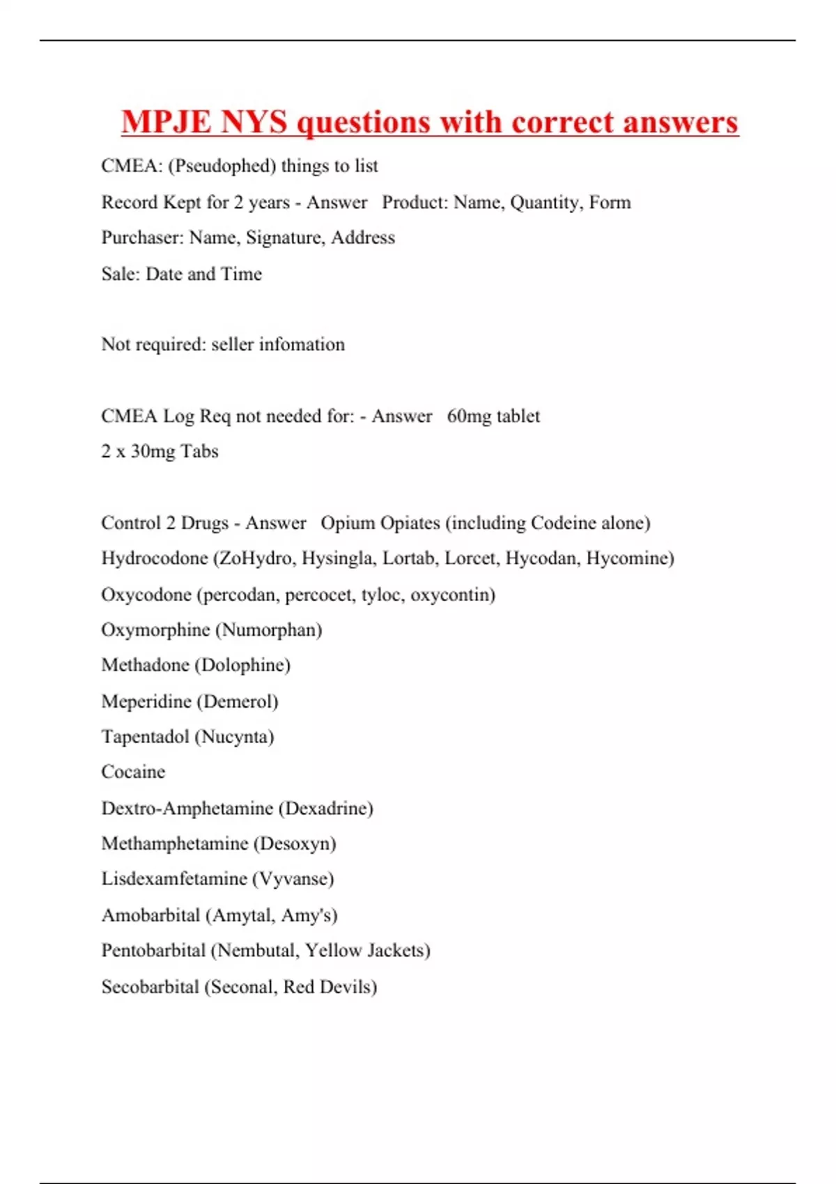 CMEA: (Pseudophed) things to list Record Kept for 2 years - Answer Product: Name, Quantity, Form Purchaser: Name, Signature, Address Sale: Date and Time Not required: seller infomation CMEA Log Req not needed for: - Answer 60mg tablet 2 x 30mg Tabs Control 2 Drugs - Answer Opium Opiates (including Codeine alone) Hydrocodone (ZoHydro, Hysingla, Lortab, Lorcet, Hycodan, Hycomine) Oxycodone (percodan, percocet, tyloc, oxycontin) Oxymorphine (Numorphan) Methadone (Dolophine) Meperidine (Demerol) Tapentadol (Nucynta) Cocaine Dextro-Amphetamine (Dexadrine) Methamphetamine (Desoxyn) Lisdexamfetamine (Vyvanse) Amobarbital (Amytal, Amy's) Pentobarbital (Nembutal, Yellow Jackets) Secobarbital (Seconal, Red Devils) Amo+Secobarbital (Tuinal) Nabilone (Cesamet) Phenylacetone