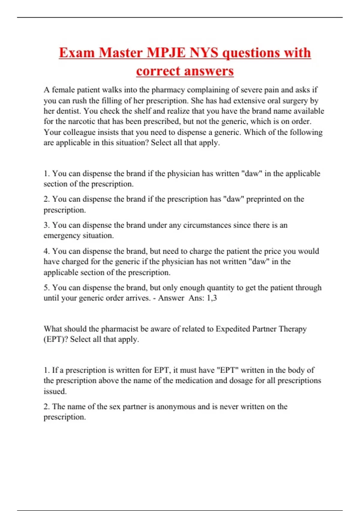A female patient walks into the pharmacy complaining of severe pain and asks if you can rush the filling of her prescription. She has had extensive oral surgery by her dentist. You check the shelf and realize that you have the brand name available for the narcotic that has been prescribed, but not the generic, which is on order. Your colleague insists that you need to dispense a generic. Which of the following are applicable in this situation? Select all that apply. 1. You can dispense the brand if the physician has written "daw" in the applicable section of the prescription. 2. You can dispense the brand if the prescription has "daw" preprinted on the prescription. 3. You can dispense the brand under any circumstances since there is an emergency situation. 4. You can dispense the brand, but need to charge the patient the price you would have charged for the generic if the physician has not written "daw" in the applicable section of the prescription. 5. You can dispense the brand, but only enough quantity to get the patient through until your generic order arrives. - Answer Ans: 1,3 What should the pharmacist be aware of related to Expedited Partner Therapy (EPT)? Select all that apply. 1. If a prescription is written for EPT, it must have "EPT" written in the body of the prescription above the name of the medication and dosage for all prescriptions issued. 2. The name of the sex partner is anonymous and is never written on the prescription.